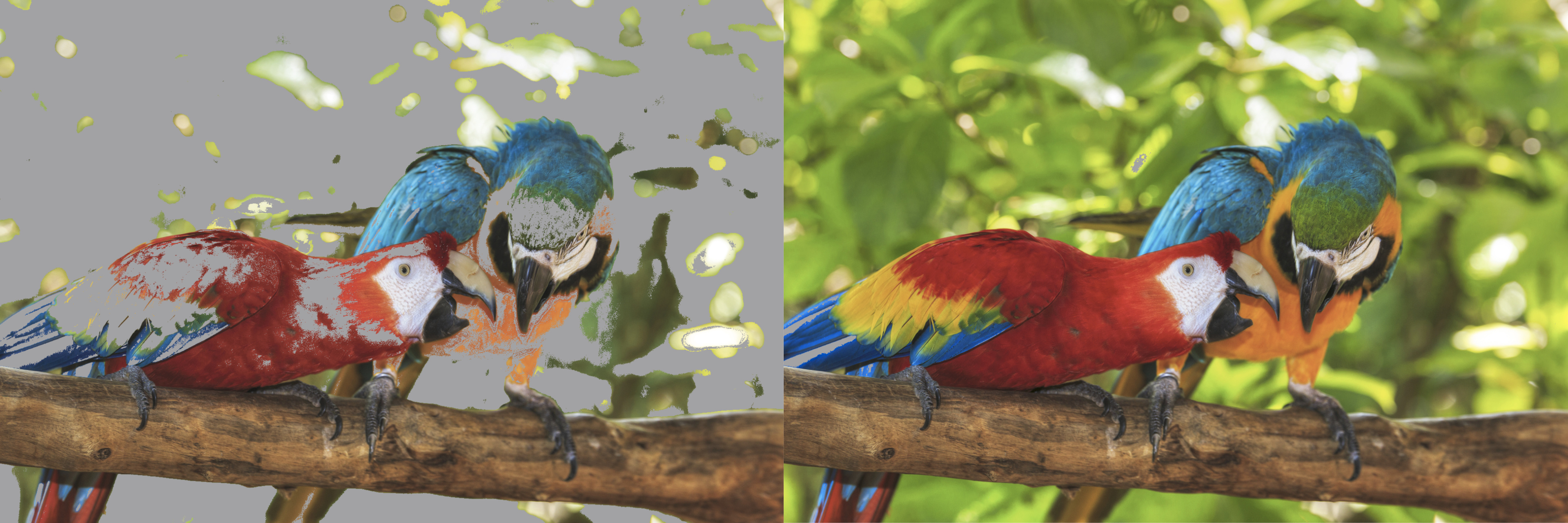 Using Adobe Photoshop's 'Gamut Warning' function, you can see below how the additional inks expand the color gamut compared to a generic CMYK (ISO Coated) printer.