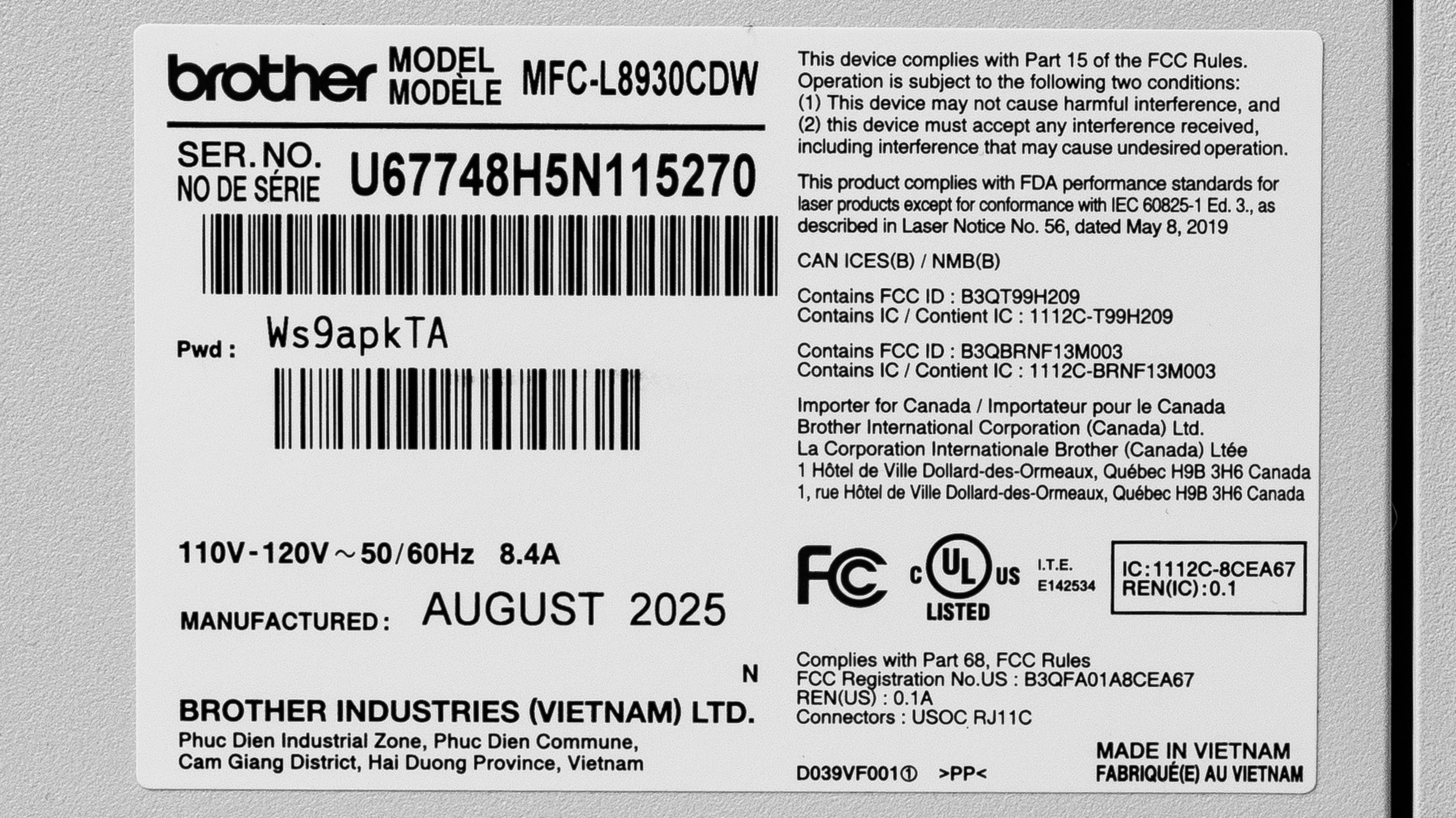We tested the Brother MFC-L8930CDW. There are a few other variants in this series of office printers, which are detailed in the table below. Here's the label of our variant.