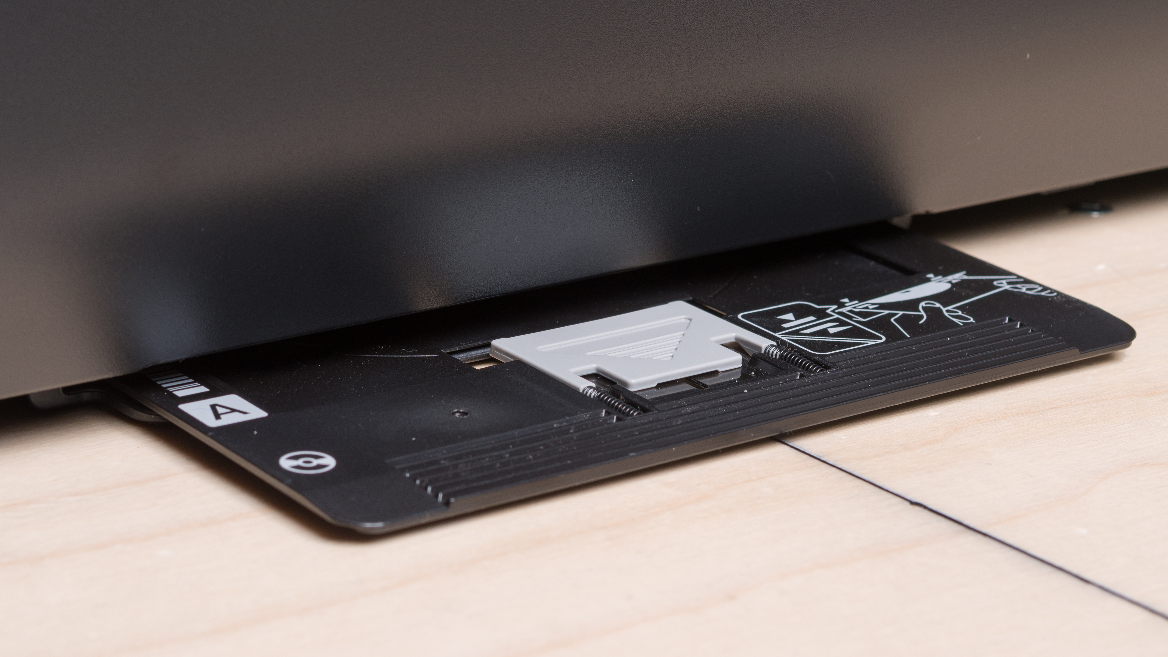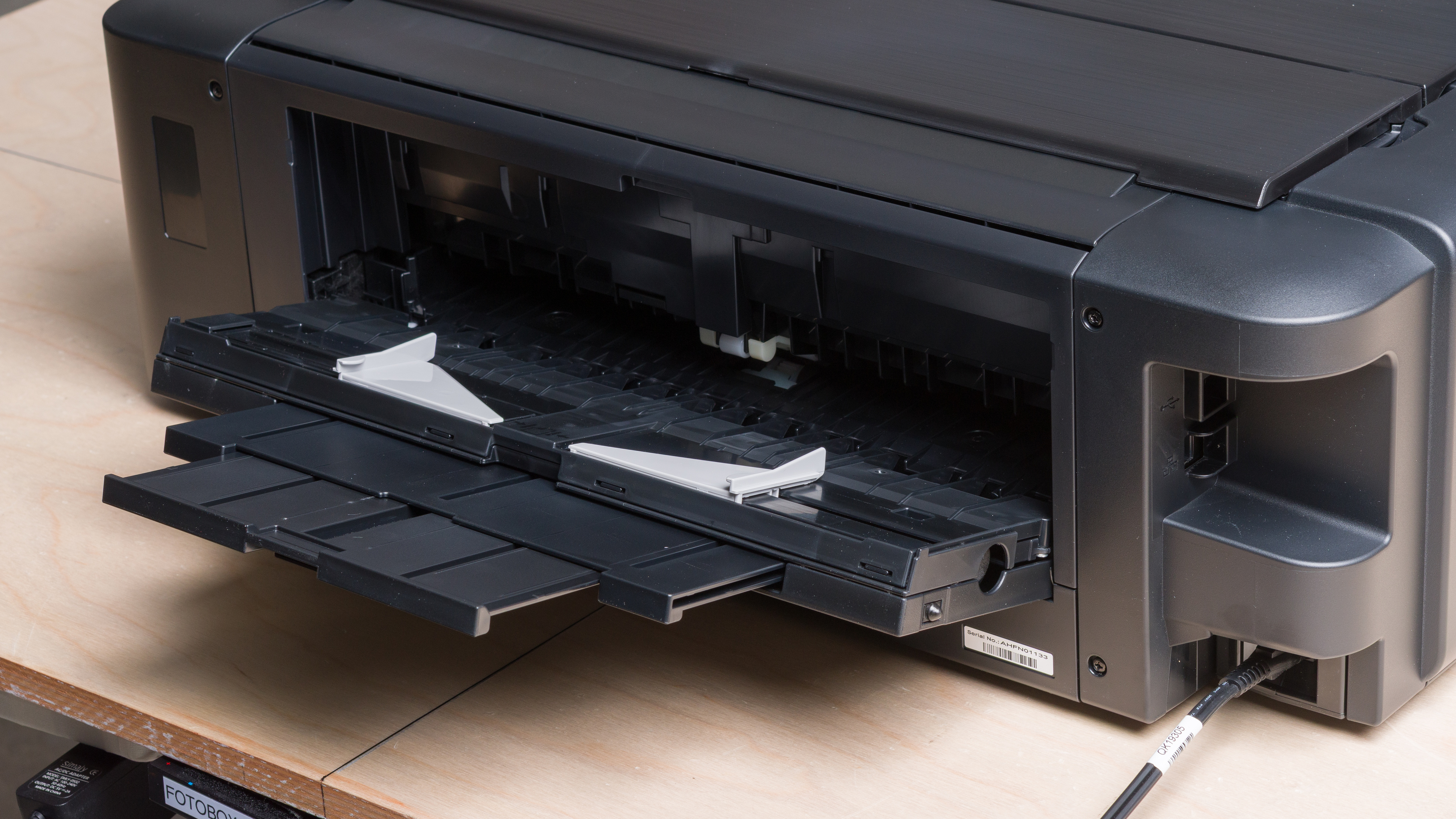 Made of thick plastic, the Canon PIXMA PRO-200S feels very well built, with no obvious gaps in the construction. The input and output trays are extendable and also feel sturdy. Its power cord is removable, making it easy to replace if damaged. The design allows for easy access to the ink cartridges, though people with larger hands might have trouble reaching the sheet rollers (also accessible via the cartridge bay) to remove paper jams due to limited space. Unfortunately, there's no cover for the rear feeder, leaving the paper exposed to dust.