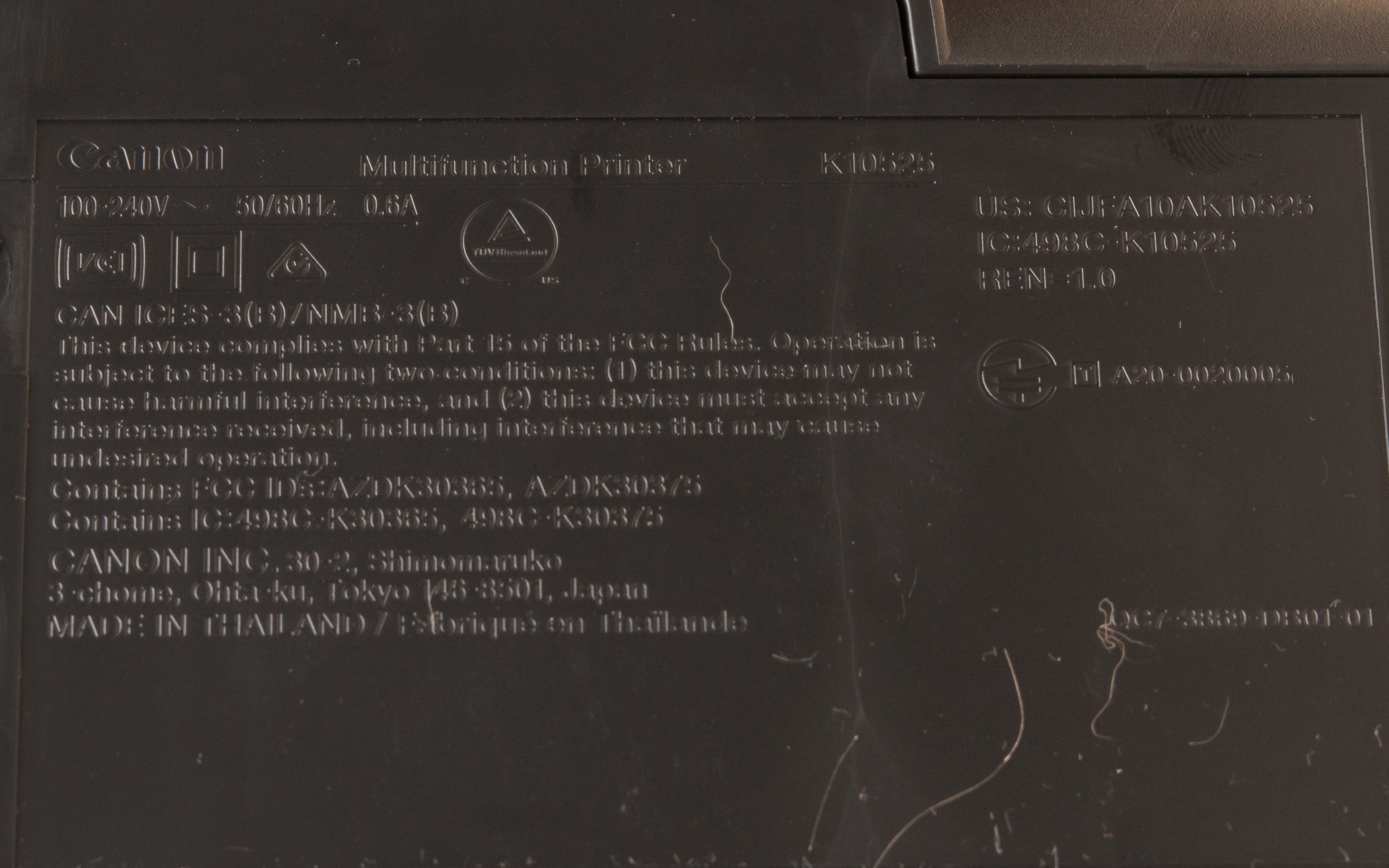 We tested the Canon PIXMA TR8620 in black, and there aren't any variants available. It's the replacement to the discontinued Canon PIXMA TR8520, which has somewhat better color page yields and prints faster. The TR8620 is also discontinued, and its successor, the Canon TR8620a, is nearly identical but the manufacturer doesn't advertise it to have Bluetooth printing. You can see our unit's label here.