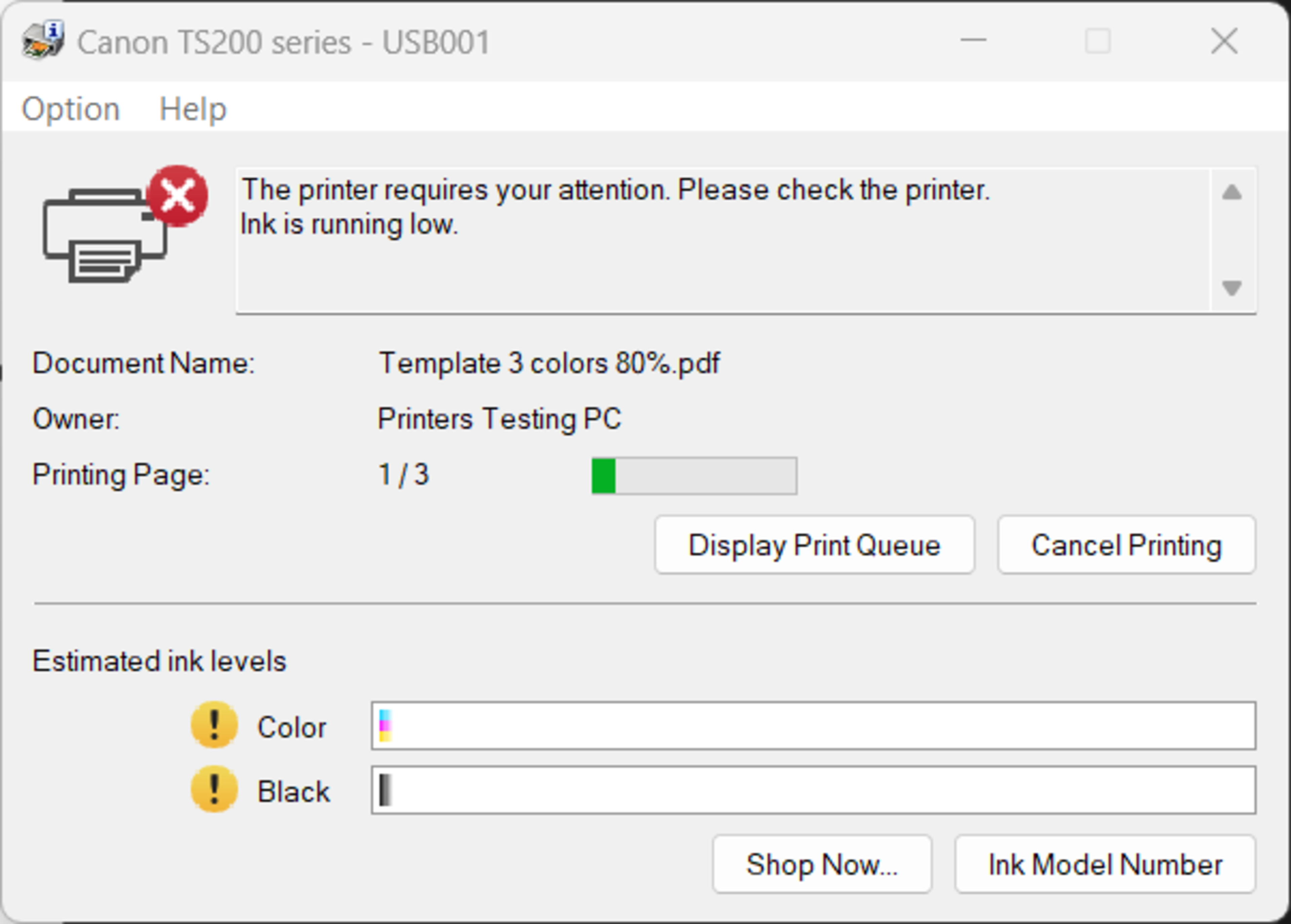 This printer has a very low page yield; you'll have to replace the cartridges often if you print regularly. Also, since this printer uses a tri-color cartridge, you must change the cartridge when one color runs out. While the printer comes with PG-243 (black) and CL-244 (tri-color) cartridges, they can be difficult to find. There aren't high-yield variants for these cartridges. It's also compatible with PG-245 (black) and CL-246 (tri-color) cartridges, which have high-yield XL variants—the PG-245 XL and CL-246 XL have an advertised page yield of 300 pages each. You receive a warning when ink levels are low, but the printer continues printing even if it's out of ink.