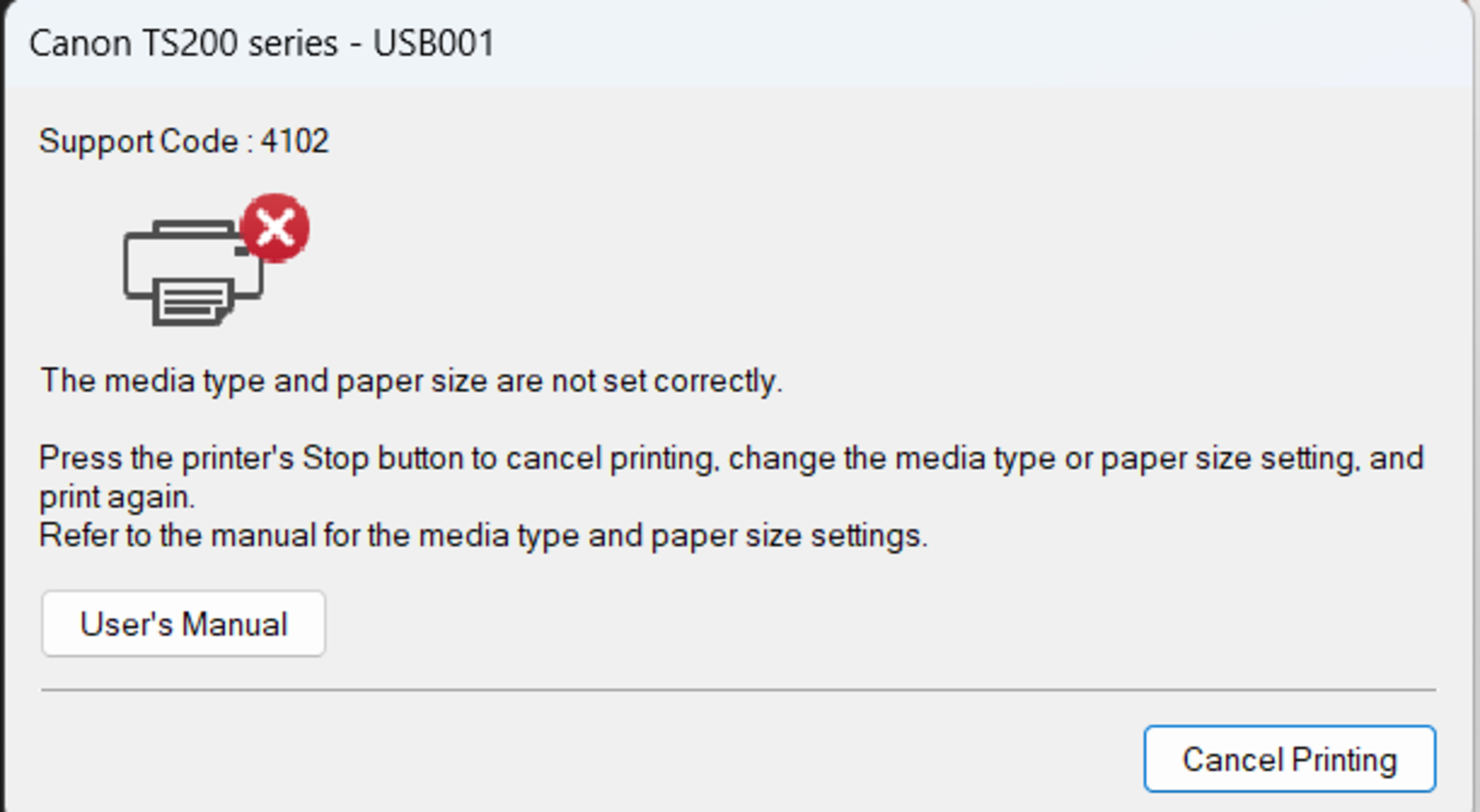 You can only print on 8" x 10" (203.2mm x 254mm) and 8.5" x 11" (215.9mm x 279.4mm) photo paper on macOS devices; Windows devices give this error message. The printer's manual states that sheet size and media support may vary depending on your OS.