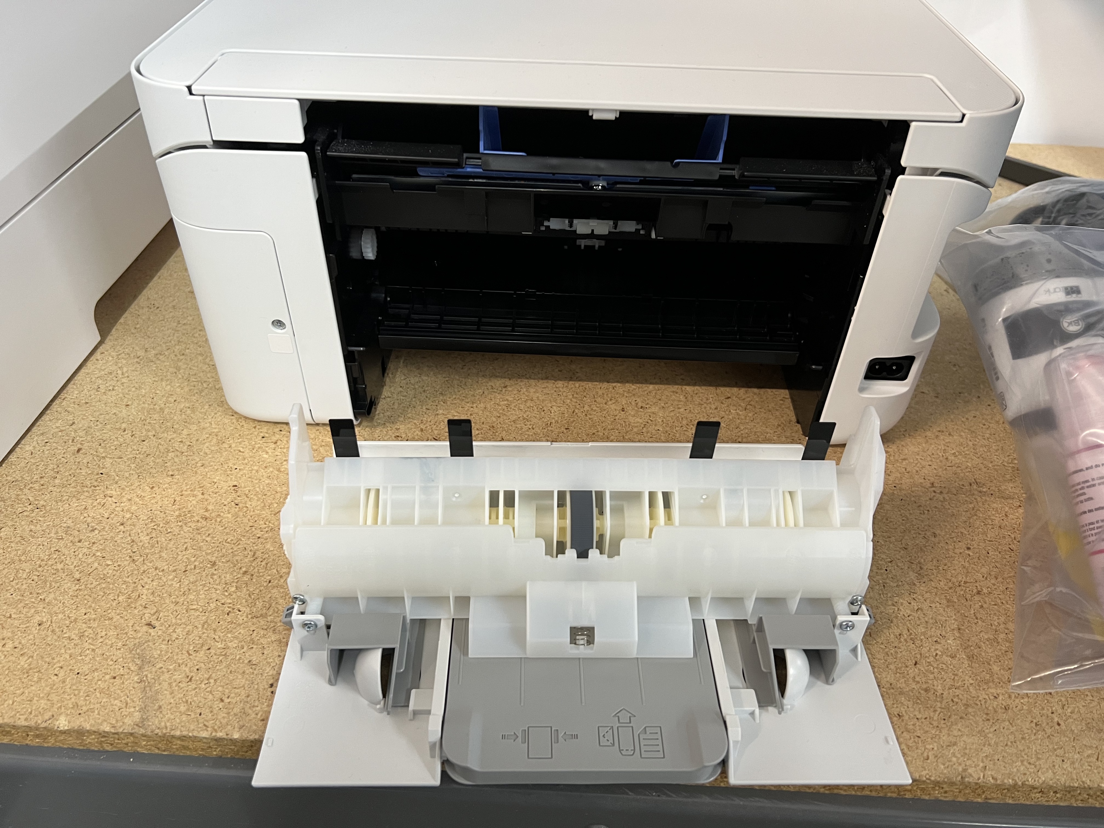 Like all inkjet printers, the printheads can clog if you don't print for a while. If you experience print quality issues, there are a few built-in maintenance functions that can help resolve them, like printhead cleaning, printhead alignment, printhead nozzle check, power cleaning, and paper guide cleaning. It's easy to reach the ink tanks for refills; you just need to lift the scanner first to open the ink tank cover. Refilling the tanks is straightforward since the ink bottle have keyed nozzles that only fit with its corresponding tank, so you won't need to worry about accidentally refilling the wrong tank. The process can be messy, but at least you don't need to do it often, thanks to its incredibly high page yields. Note that once you refill the tanks, you need to reset the ink level counter each time since the printer can't measure exactly how much ink you have left. The sheet rollers are accessible by removing a panel at the back or by lifting the flatbed scanner. The paper tray can only hold 100 pages, so you have to add paper if you print many long documents.