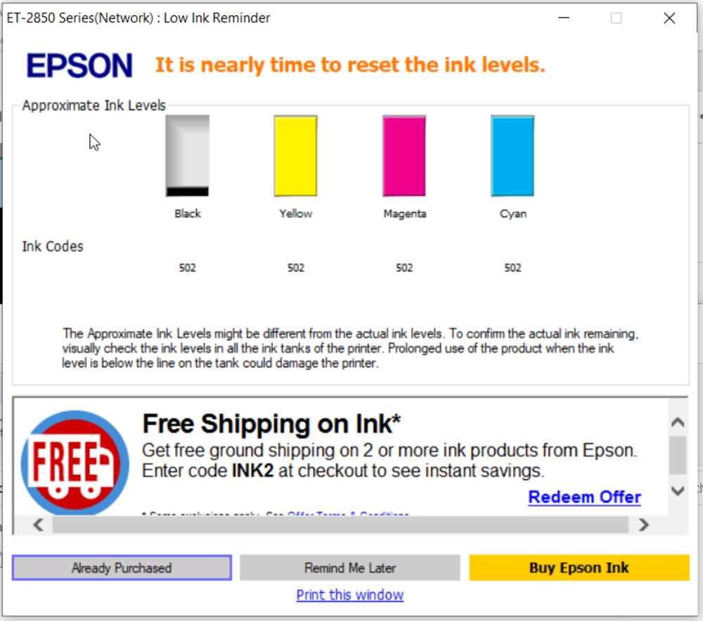 This printer yields an incredible number of pages thanks to its supertank system. There's no ink level sensor to precisely measure the remaining ink. Instead, the printer monitors ink usage internally to estimate when the ink levels run low, meaning you'll have to keep an eye on the ink levels to avoid completely emptying the tank, as doing so could introduce air bubbles into the print tubes and damage the printheads. You'll have to manually reset the ink levels when you refill the tanks. The printer will continue printing even when it's out of ink. While there's no formal warning for low ink levels, you will receive this reminder once ink levels drop roughly below a quarter full.