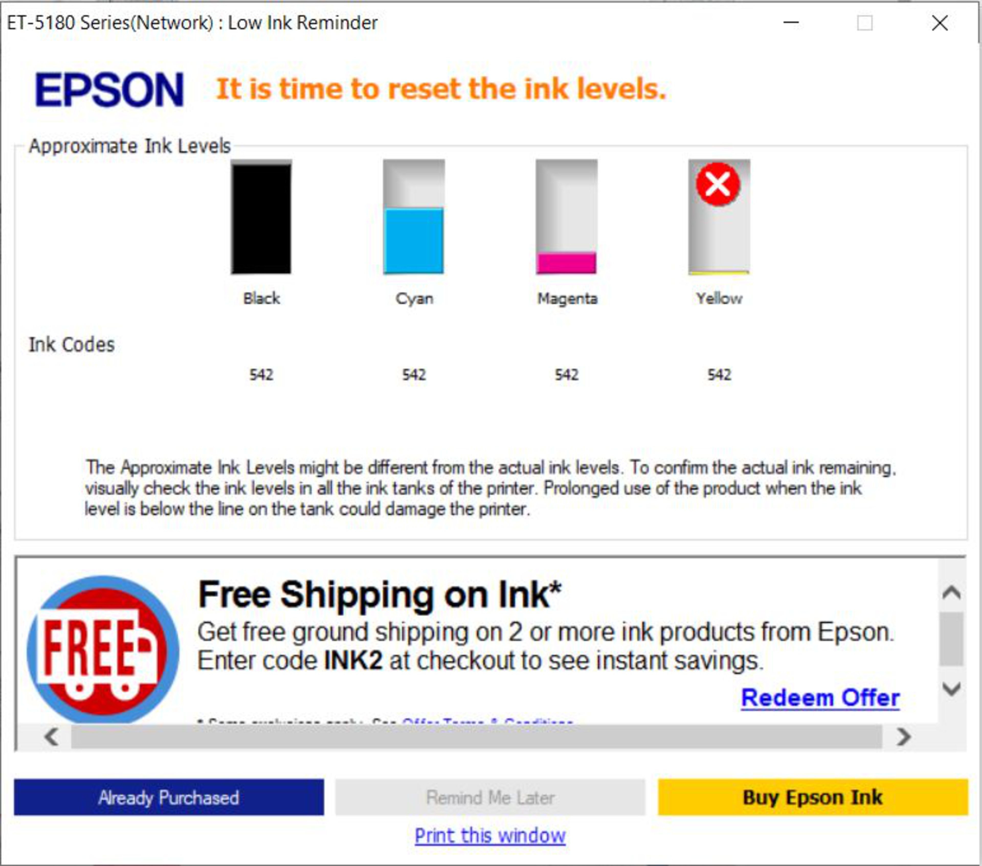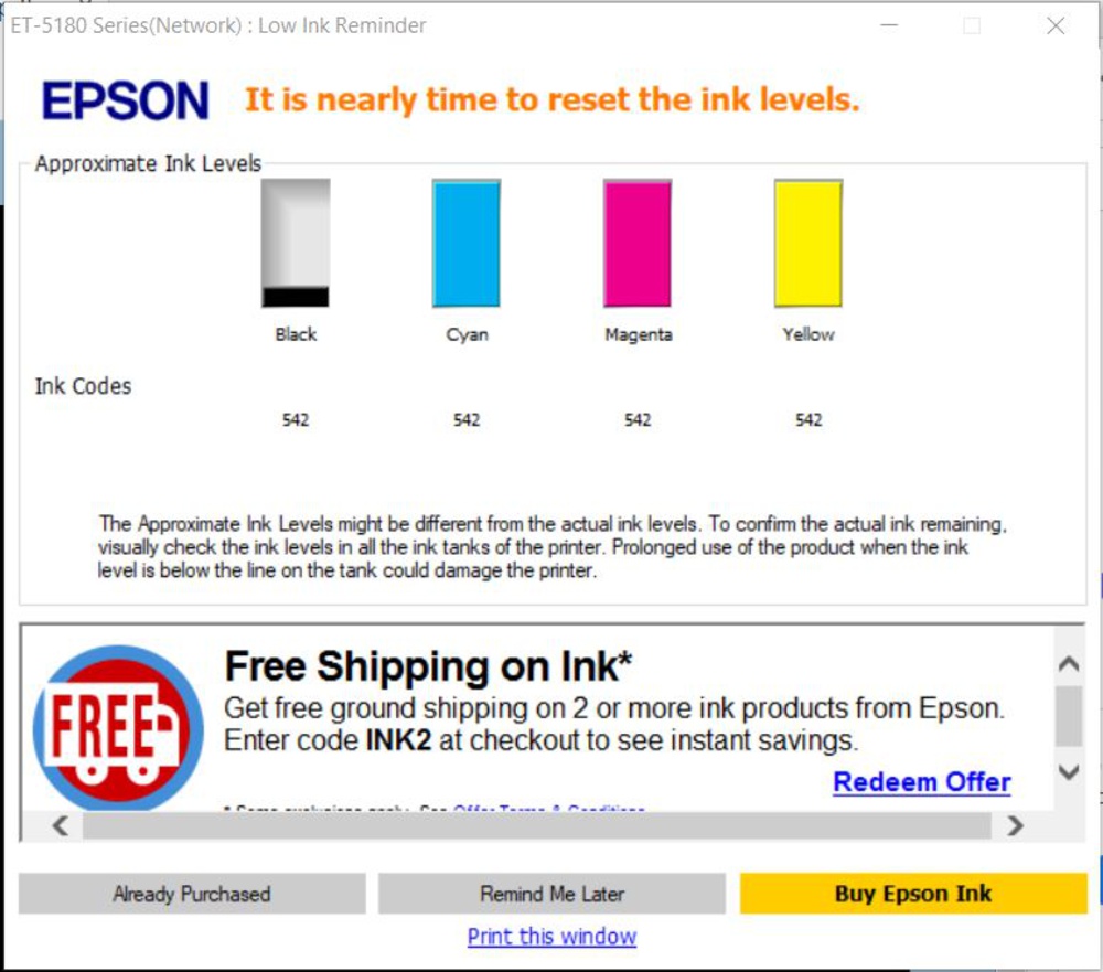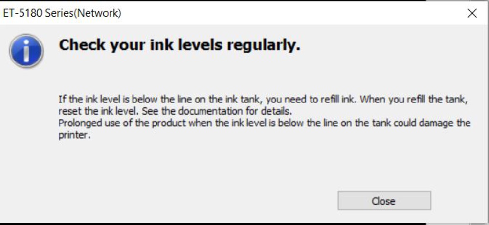 The Epson ET-5180 yields a remarkably high number of pages with a full ink tank, which means you won't have to refill the tank all that often unless you regularly print in bulk. The tank should never be empty, and the printer will remind you to check the ink level before it begins a print job. A message also pops up when the ink runs low, but the printer doesn't stop printing. It'll only stop when the ink reaches the lower line, prompting this message. You don't need to refill the tank if you don't need to; however, you need to change the ink level in the settings to continue printing. If you refill the tank but don't have enough to fill to the top, you can set the exact ink level so that the printer can more accurately track how much is left.