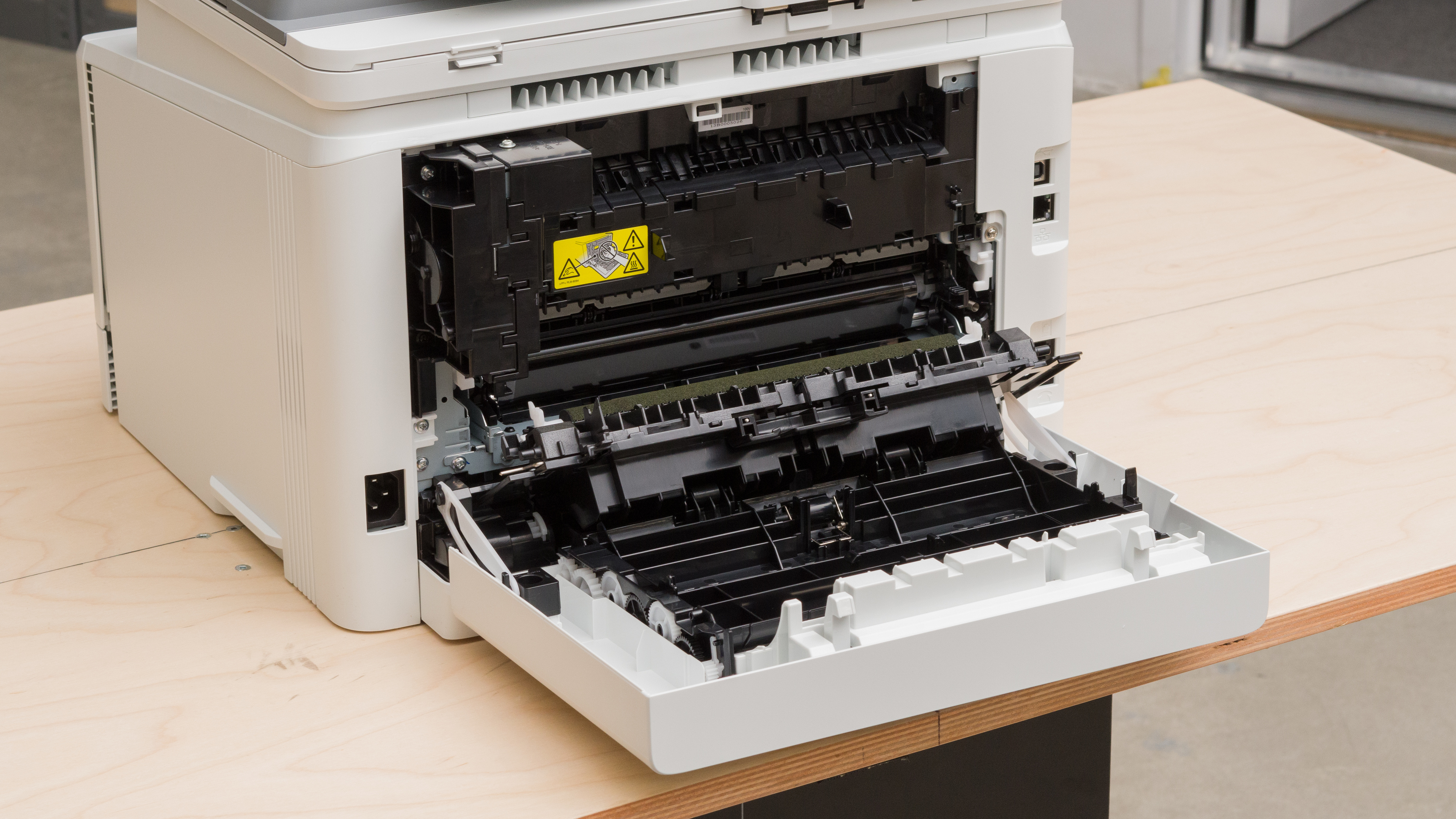 This printer doesn't need much maintenance. Unlike inkjet printers, there's no risk of printhead clogging. There are still a few maintenance functions built-in if you experience print quality issues, like Adjust Alignment, Cleaning Page, and Color Calibration. There's also a general troubleshooting function to resolve fax and network connection issues. The toner cartridges last a long time, so you won't need to replace them often unless you print a lot, and you don't need to replace the drum separately because it's built into the cartridges. To access the cartridges, you only need to open the front cover and pull out the drawer. For paper jams, you can access the sheet rollers through a panel on the back. You can access the sheet rollers through the removable (manual) input tray or by lifting the scanner. The input tray holds 250 sheets of paper, which is a pretty good amount, so you likely won't need to refill it often.