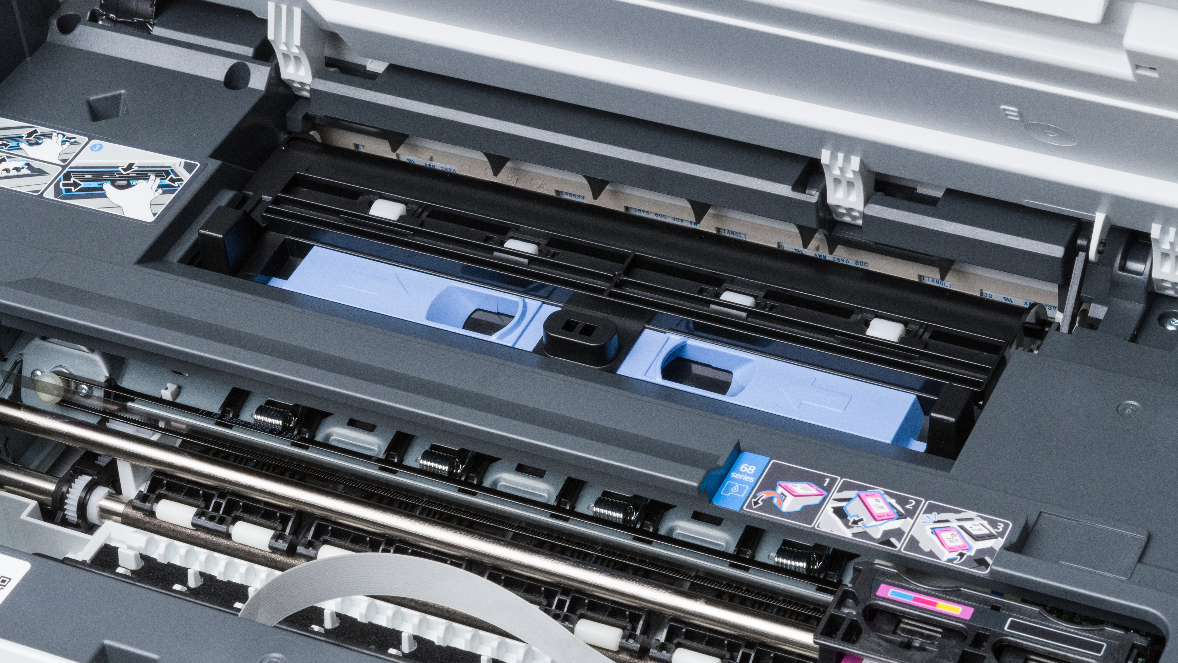 Replacing the ink cartridges is straightforward; simply turn the printer on and lift the cover. This will automatically prompt the printer to move the cartridge tray to the left, making the cartridges accessible. The printer recommends performing an alignment each time you insert a new cartridge; however, you can skip it if you don't think it's necessary. Paper jams can be accessed by lifting the scan bed and removing the cover below it. You can also clear paper jams from the bottom by fully extending the input tray, although you'll need to turn the printer on its side to do so. You can remove paper jammed in the automatic feeder by lifting the cover of the feeder.