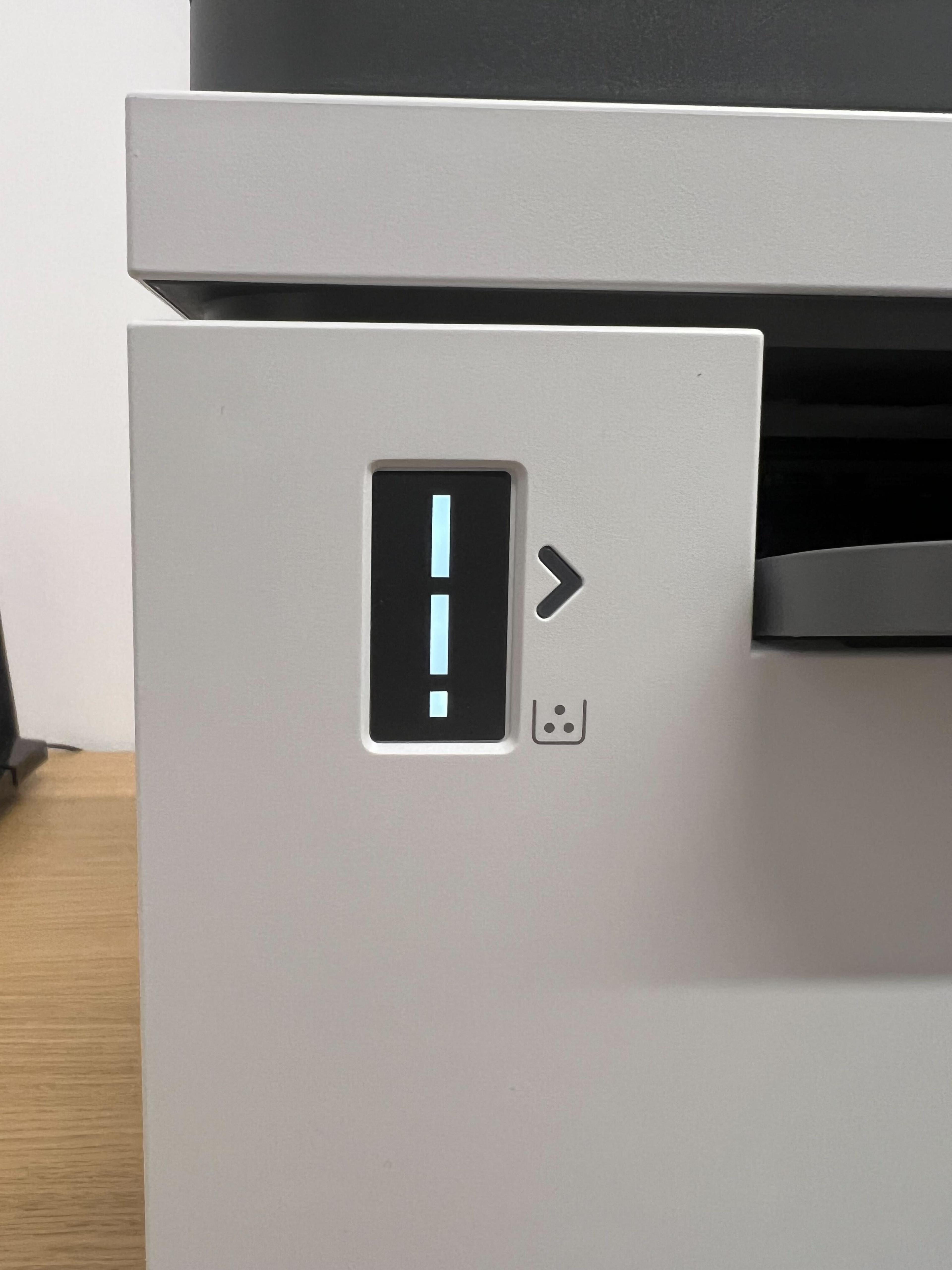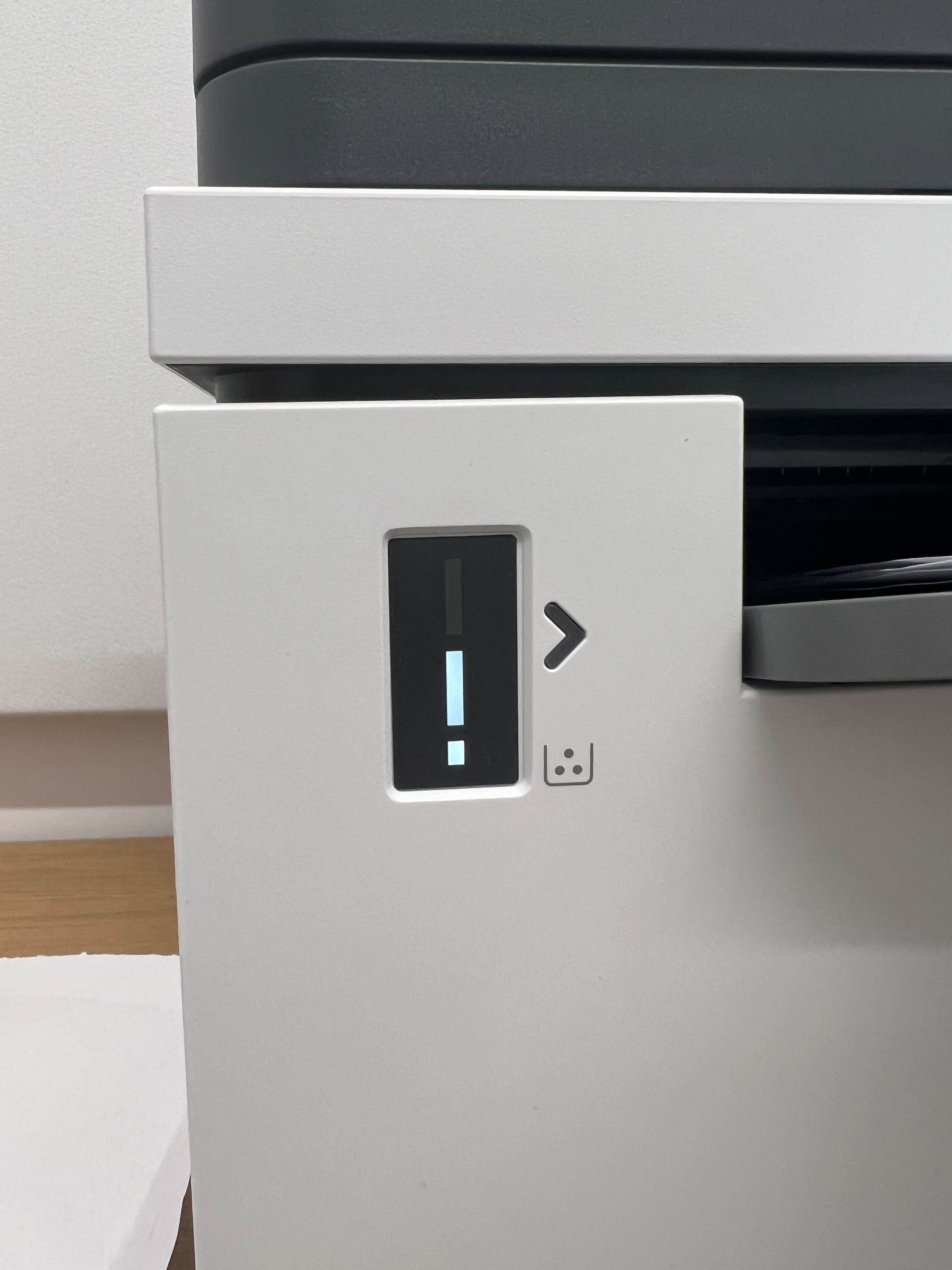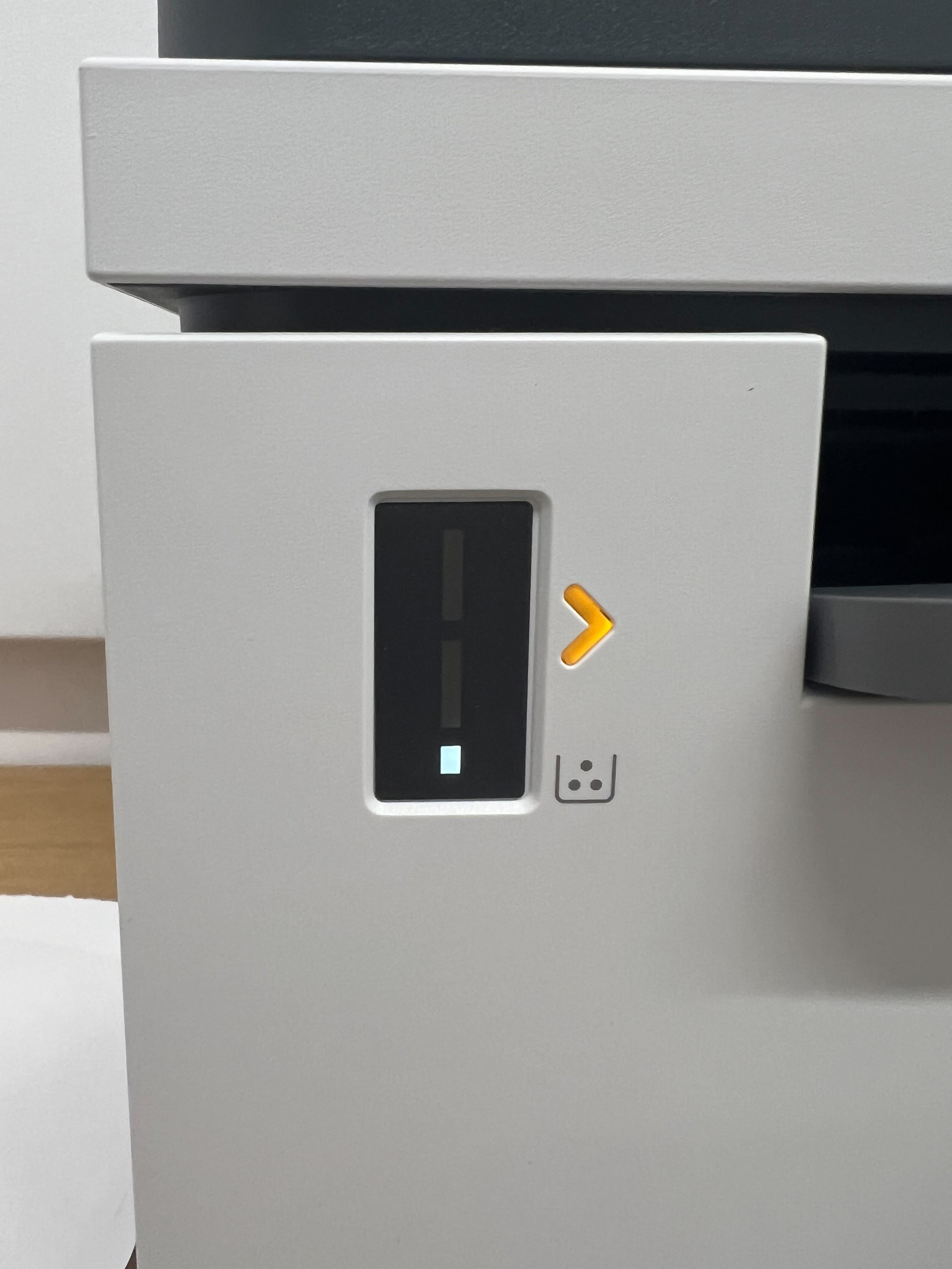 There's a little display at the front to give you an idea of how much toner is left, as seen here. When the tank is half-empty, it shows a single bar. When the tank is nearly empty, only the last remaining part of the bar indicator is illuminated. However, when the printer determines that you've run out of toner, the last portion of the bar indicator turns yellow, and the status light to its right starts flashing. You can refill the toner reservoir even during a print job.