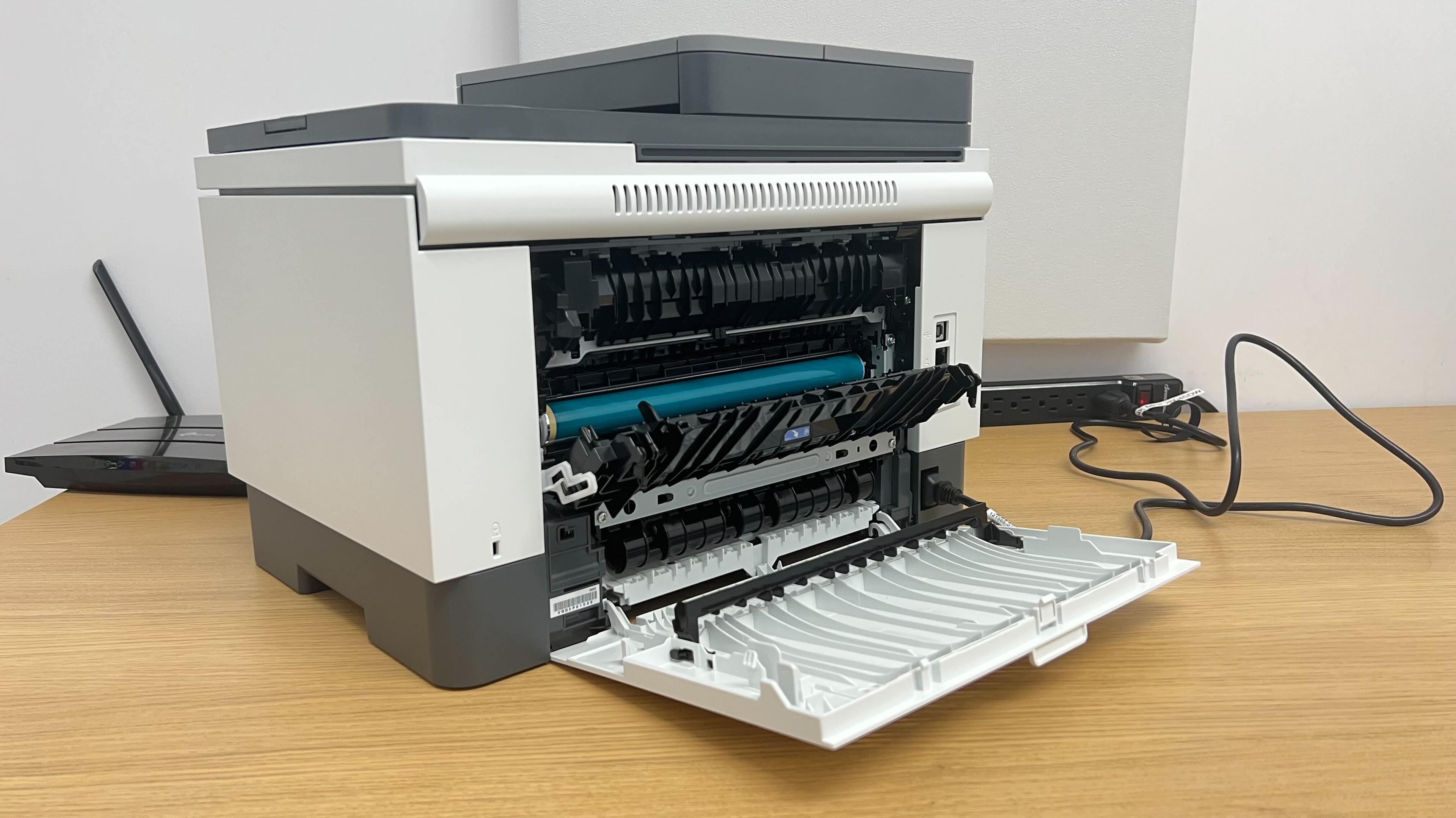 Unfortunately, access to the sheet rollers is somewhat limited. To reach them, you can remove a panel at the rear of the printer (as seen here), flip the printer on its side and reach any sheets just past the input tray (as seen here), or lift the scanner to pull out any jammed sheets that would have come out of the output tray. None of these methods makes it very easy to remove any jammed sheets, and if any were to tear, it'd be pretty hard to clear out the remaining pieces.