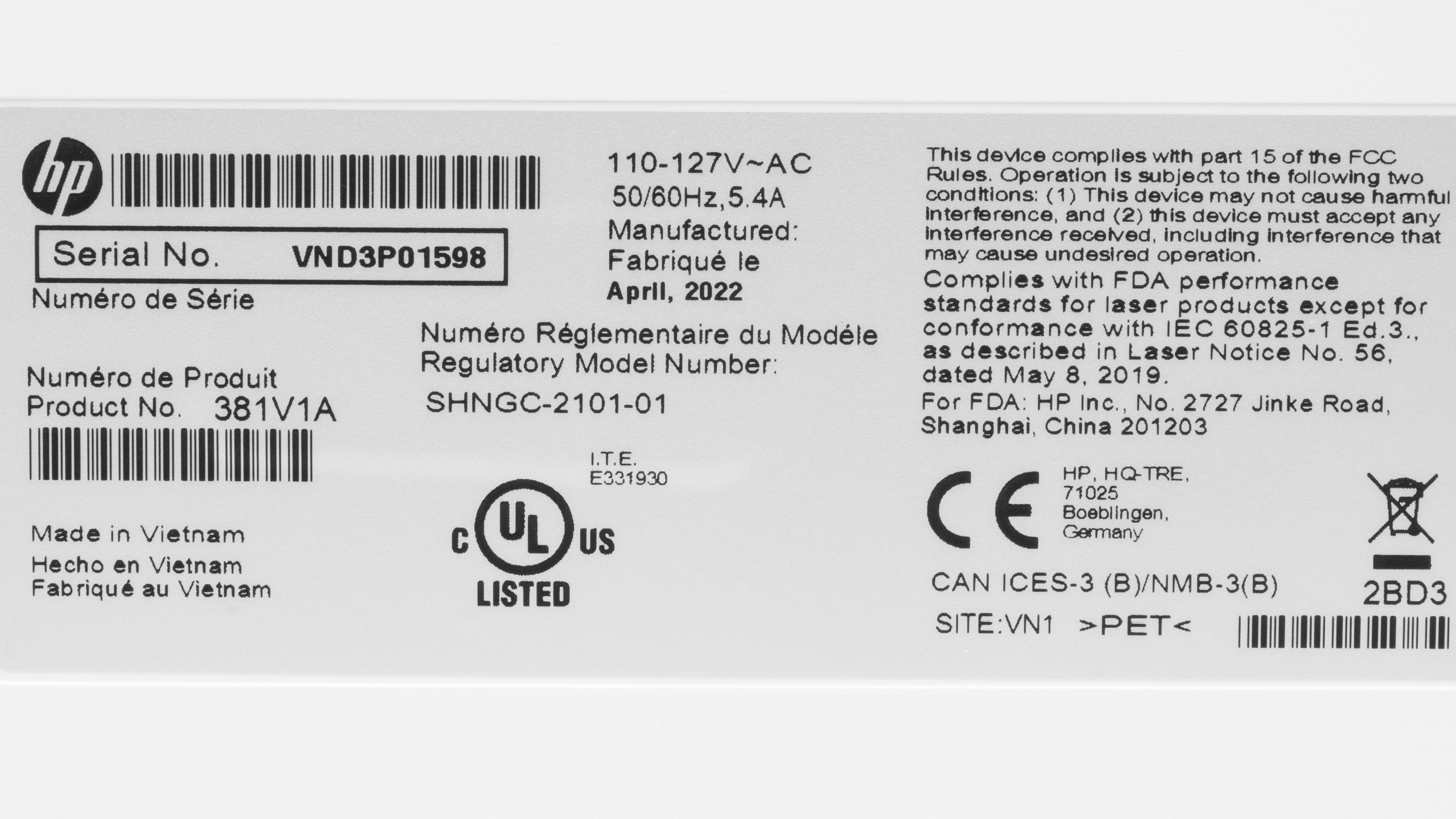 There are multiple variants of the HP LaserJet Tank MFP 2602-2606 series, which differ in terms of wireless connectivity options, region of sale, and scanner features. We tested the LaserJet Tank MFP 2604sdw Printer (381V1A) variant, and you can see a photo of its label here.