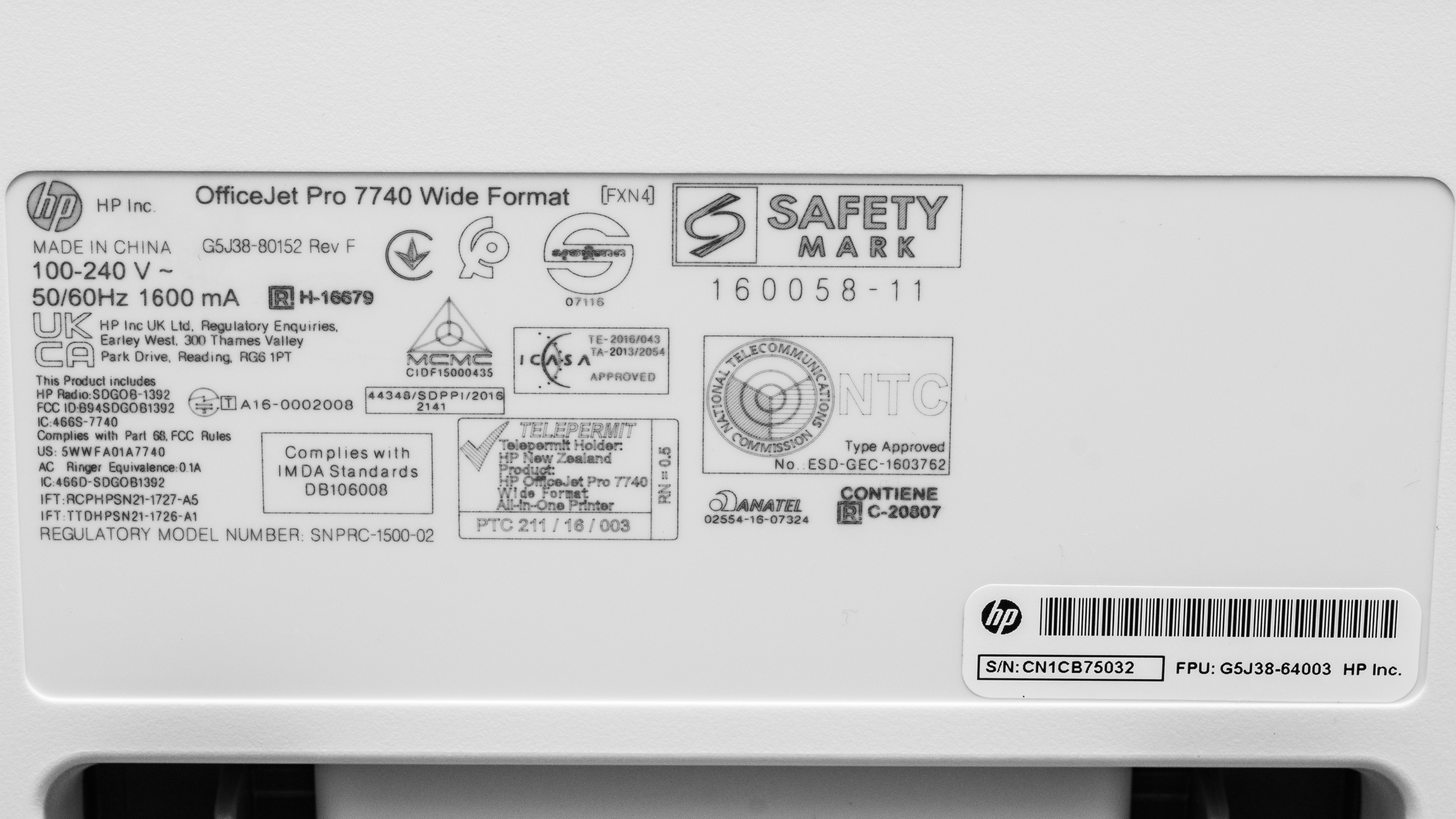 We tested the HP OfficeJet Pro 7740 in black and white. It isn't available in any other color schemes or variants. You can see our unit's label here.