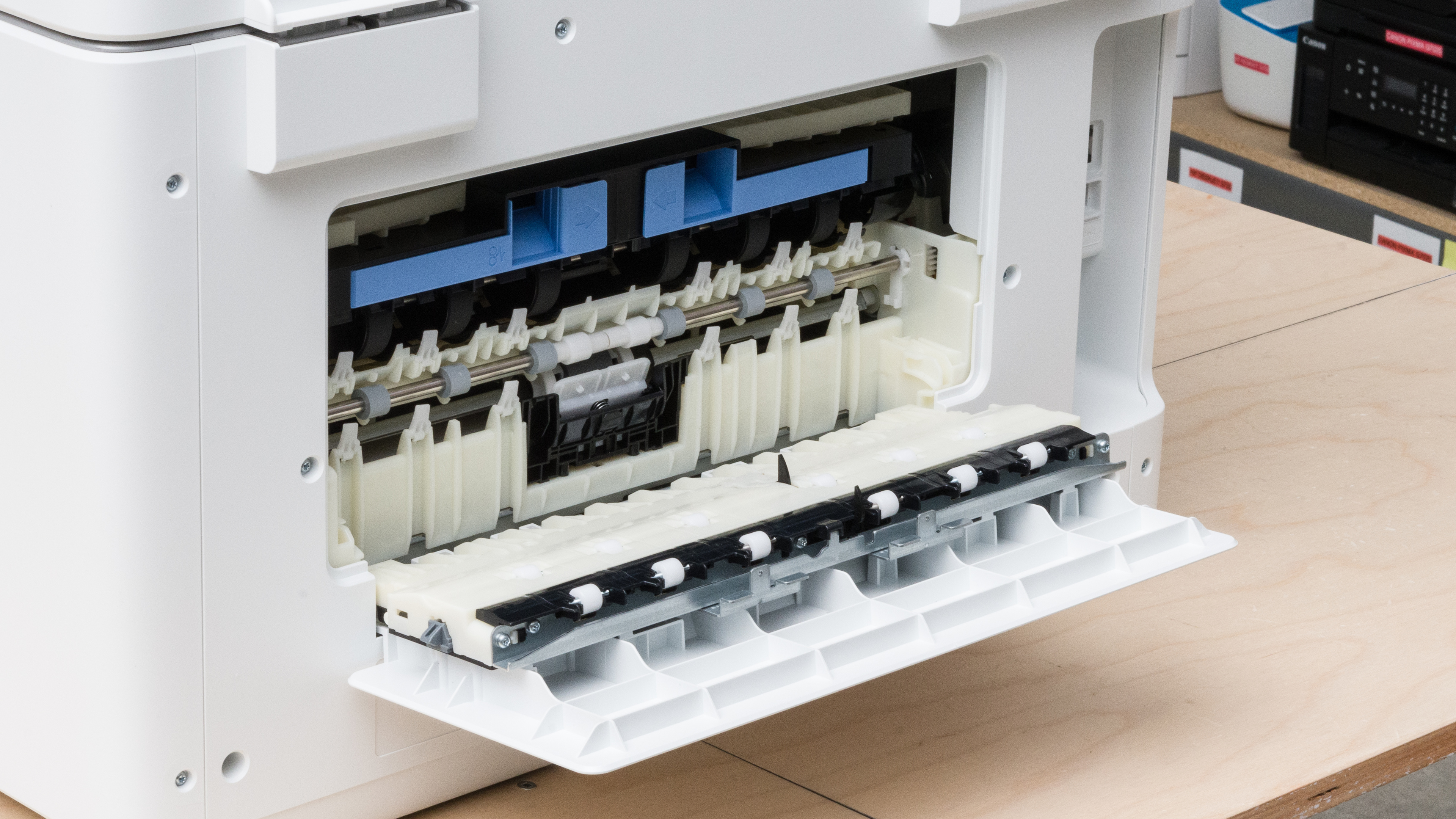 As for ink maintenance, the cartridges have a fairly decent yield, so you only have to replace them occasionally unless you're printing many sheets daily, like in a busy office setting. Replacing the ink cartridges is easy; just turn on the printer and pull down the front panel to reveal the cartridges. The cartridge holders are spring-loaded, so you need to push on the cartridge itself to release it. Accessing the sheet rollers is a bit more complicated. You get decent access from the back of the printer by removing the rear panel; if you need front access, you can get partial access via the cartridge bay by pushing the print carriage out of the way. Depending on the location of the jam, you may also need to remove the two input trays and the output tray. The input trays hold 250 sheets each, for 500 sheets total, so you shouldn't have to replenish them often.