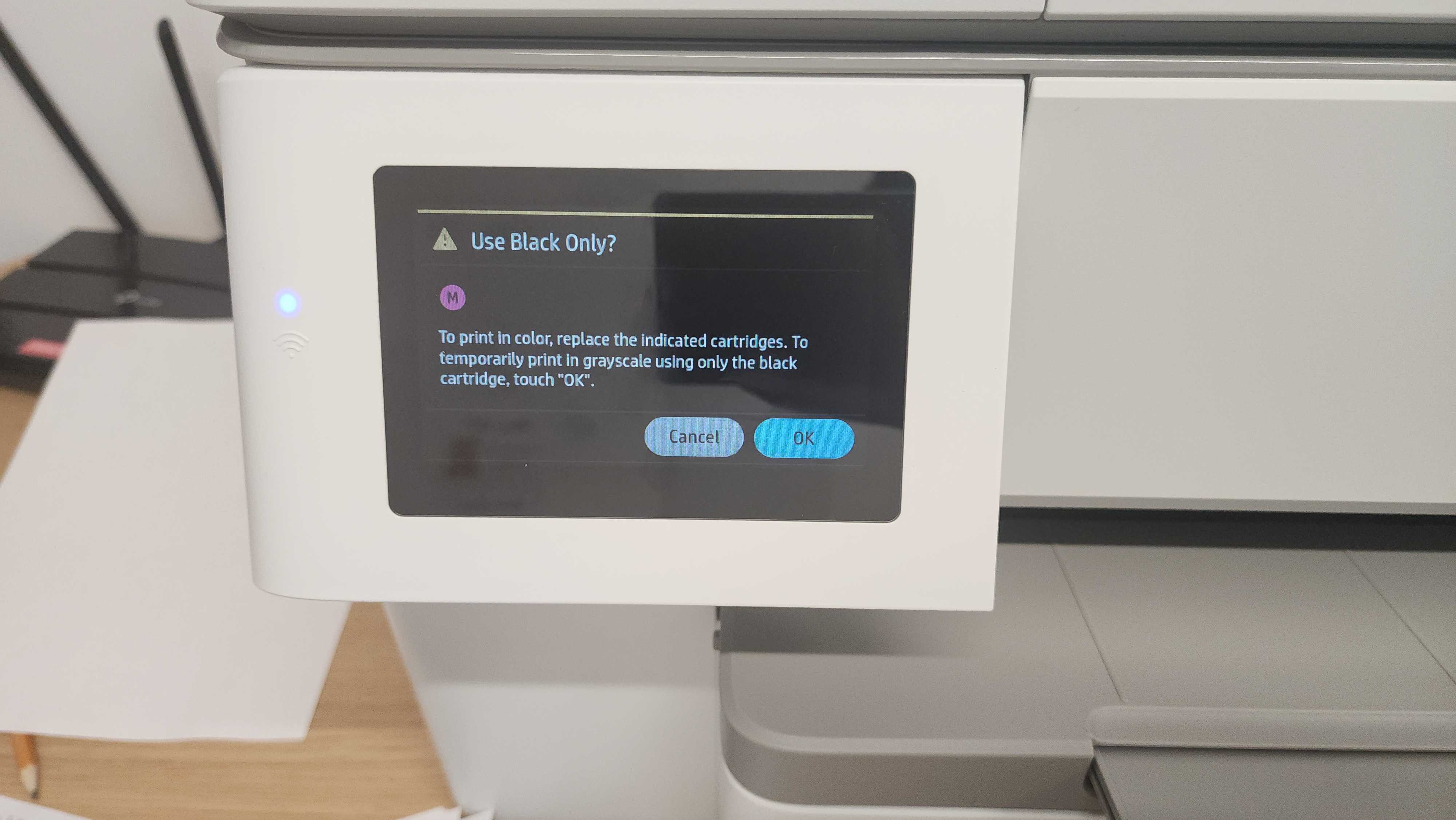 The printer warns you when the ink is low and again when the cartridge is empty. You can't print in color when one of the color cartridges is empty; if you're in the middle of a color print job, the printer will prompt you to resend it in black. Finally, you can't print in color without a black cartridge installed.