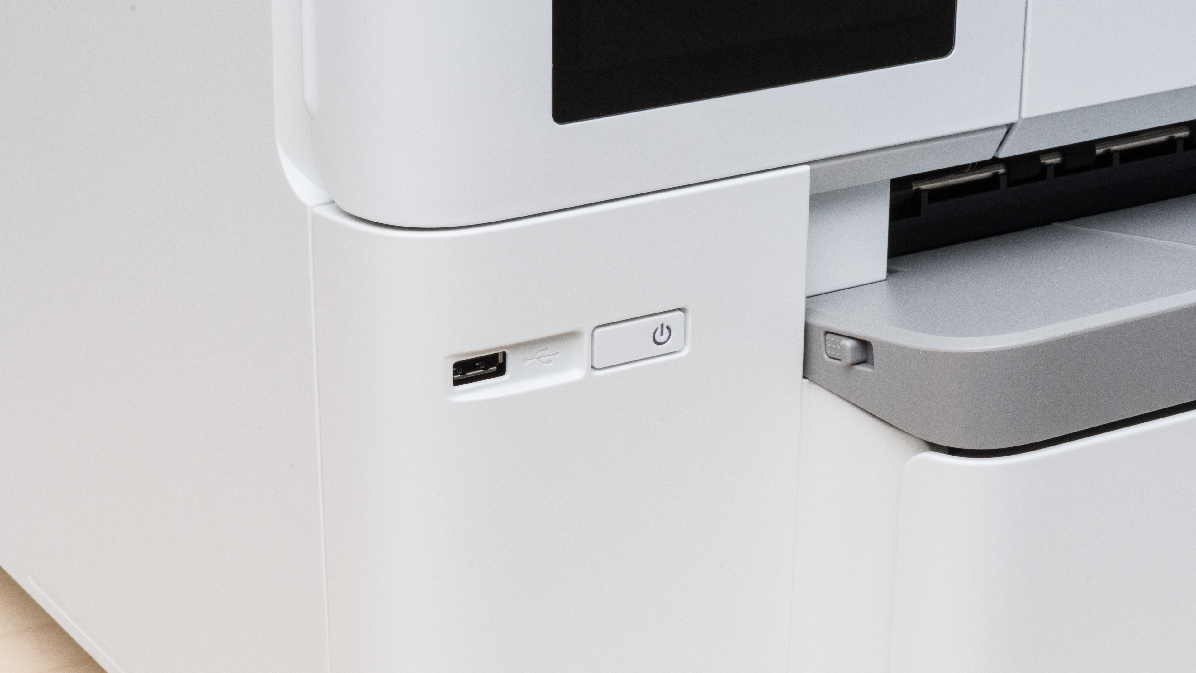 Some areas aren't as positive. There's a loud clipping noise when raising the lid, and there's no damper to prevent the lid from smacking down when it's below 45 degrees. The display's hinge has its own quirks as well, as it exhibits quite a bit of movement even when it's set to its resting position. Another issue is that the printer tends to shake violently if you're printing multiple pages in succession. Finally, our unit is missing part of the logo.