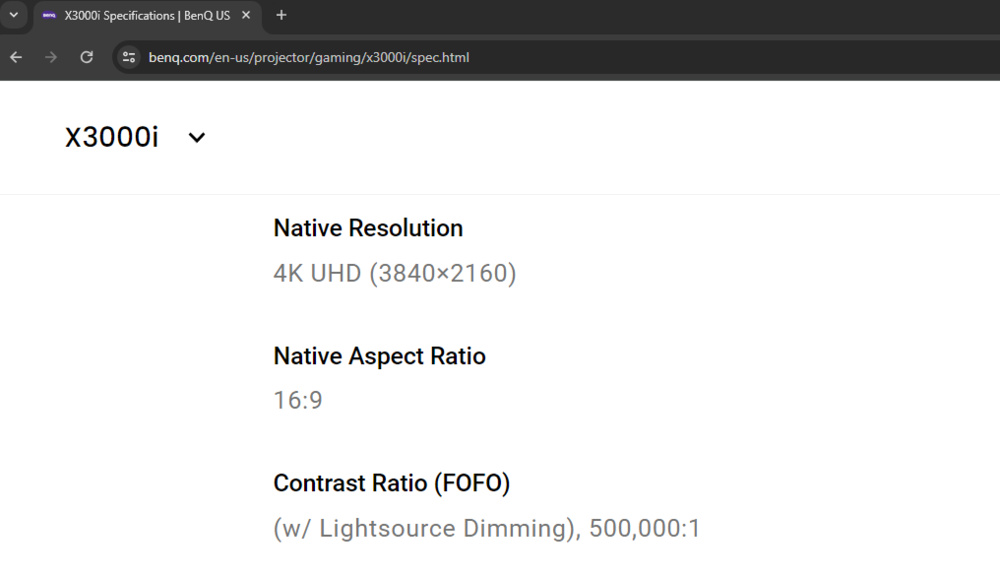 Contrast ratios being comparatively low on paper for projectors has resulted in marketing specifying contrast values you'll never experience watching real content. Values are usually quoted as either FOFO (full-on/full-off) or Dynamic Contrast. But don't take our word for it. BenQ provides the answer in their article called The Myth of High Contrast: "...Given the average consumer's tendency to equate higher numbers with being "better," most brands have favored the use of FOFO contrast ratio in their contrast specifications." It's advice so good that they're following it themselves, as we can see in the figure to the right. |