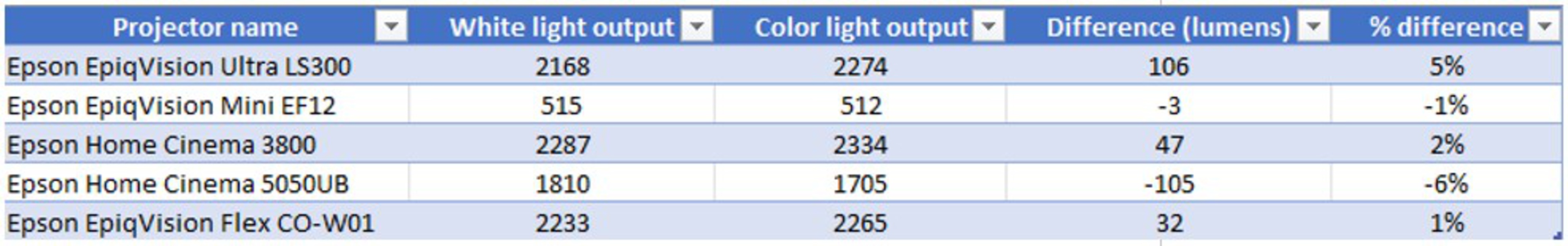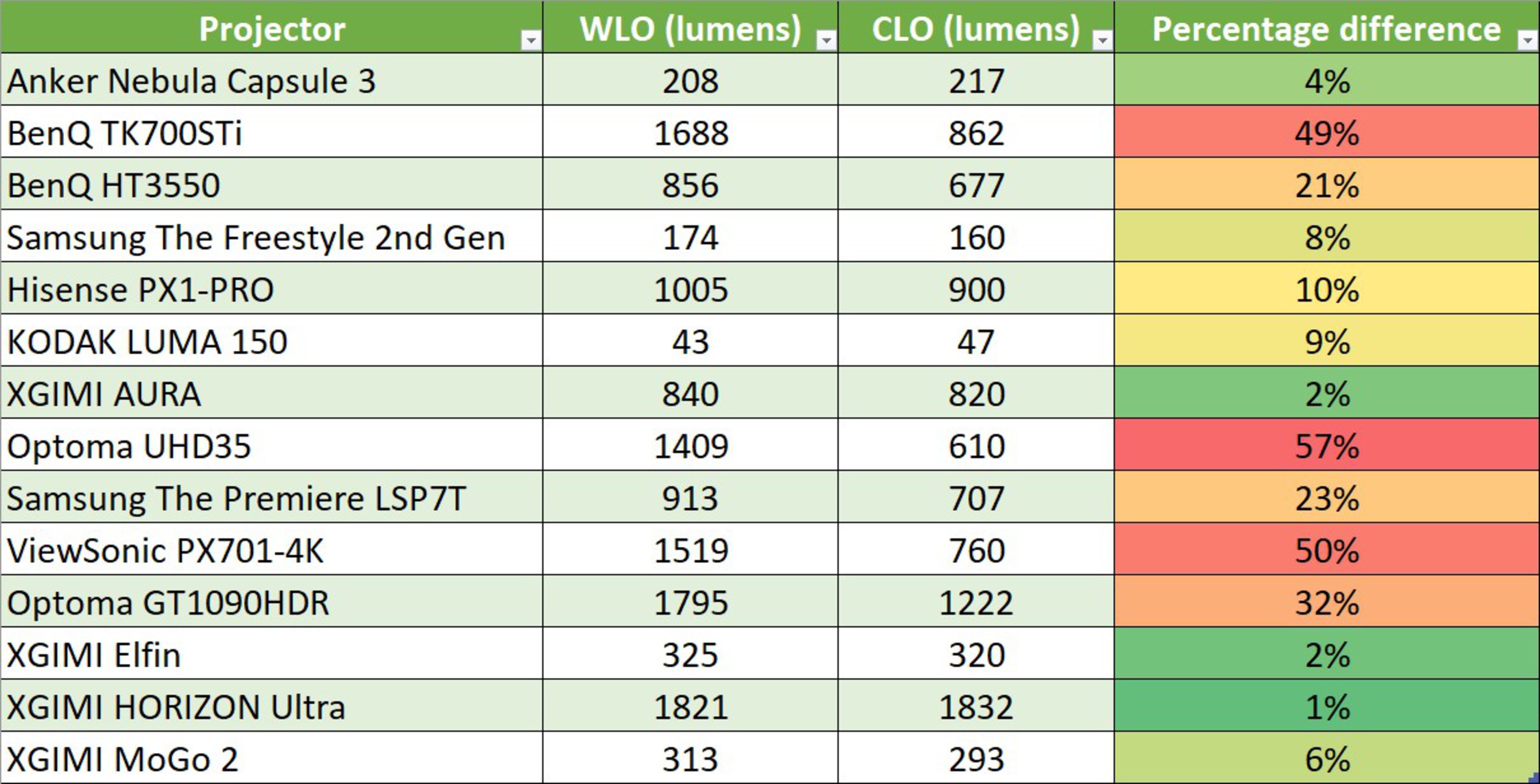 Table showing white light output (WLO) compared to color light output (CLO) for select DLP projectors we've tested.