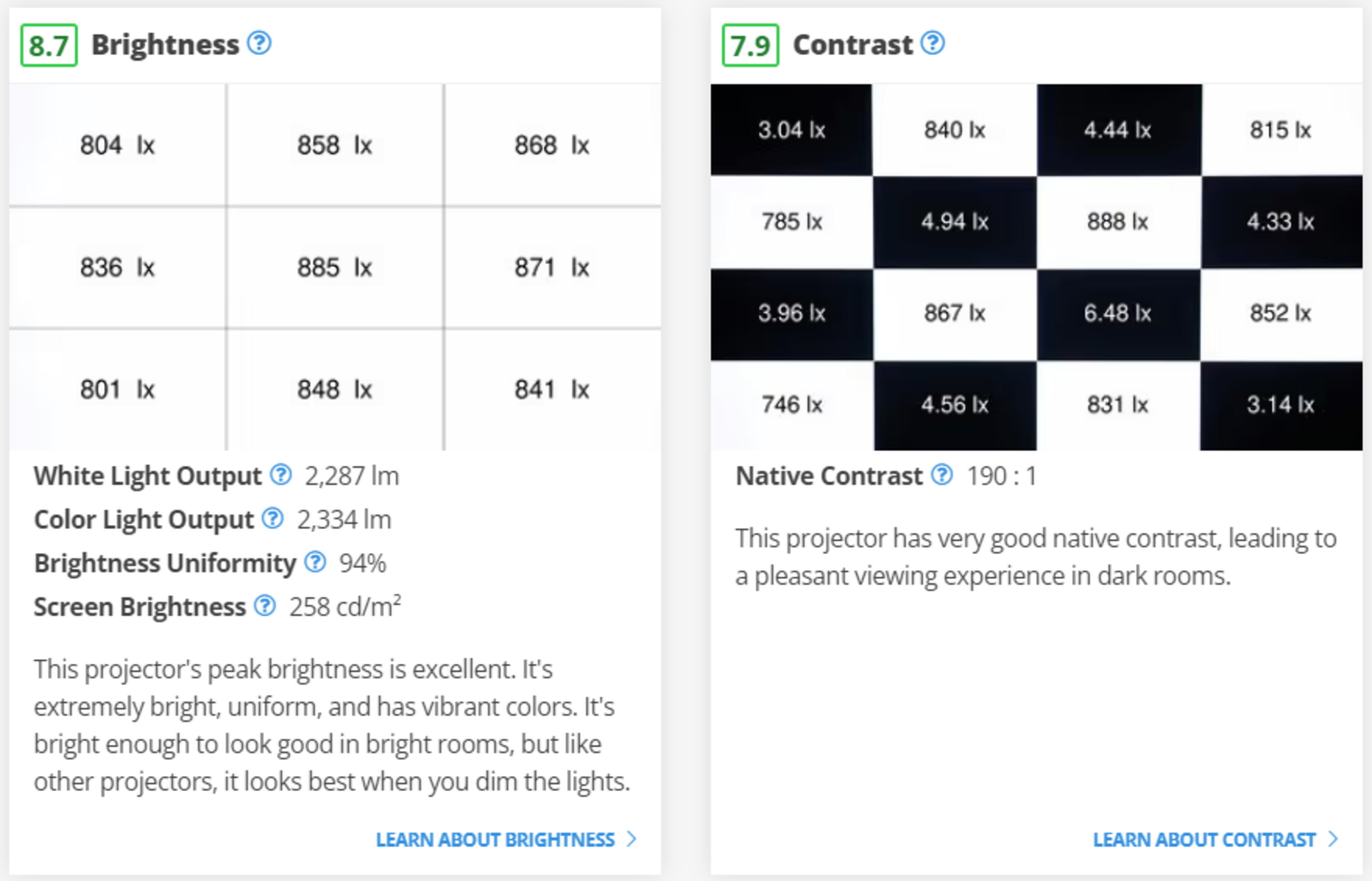 Our test results for brightness and contrast of the Epson Home Cinema 3800