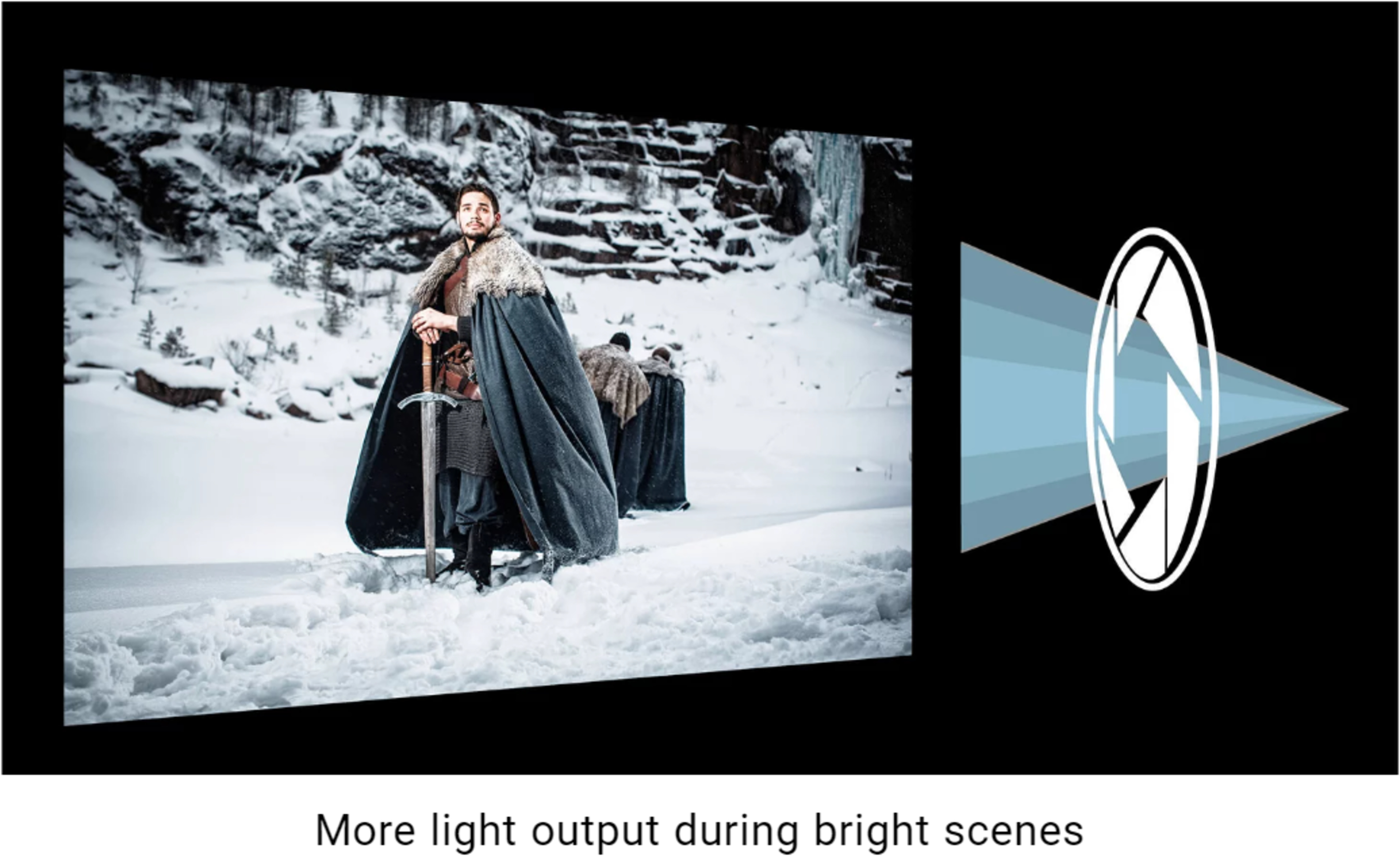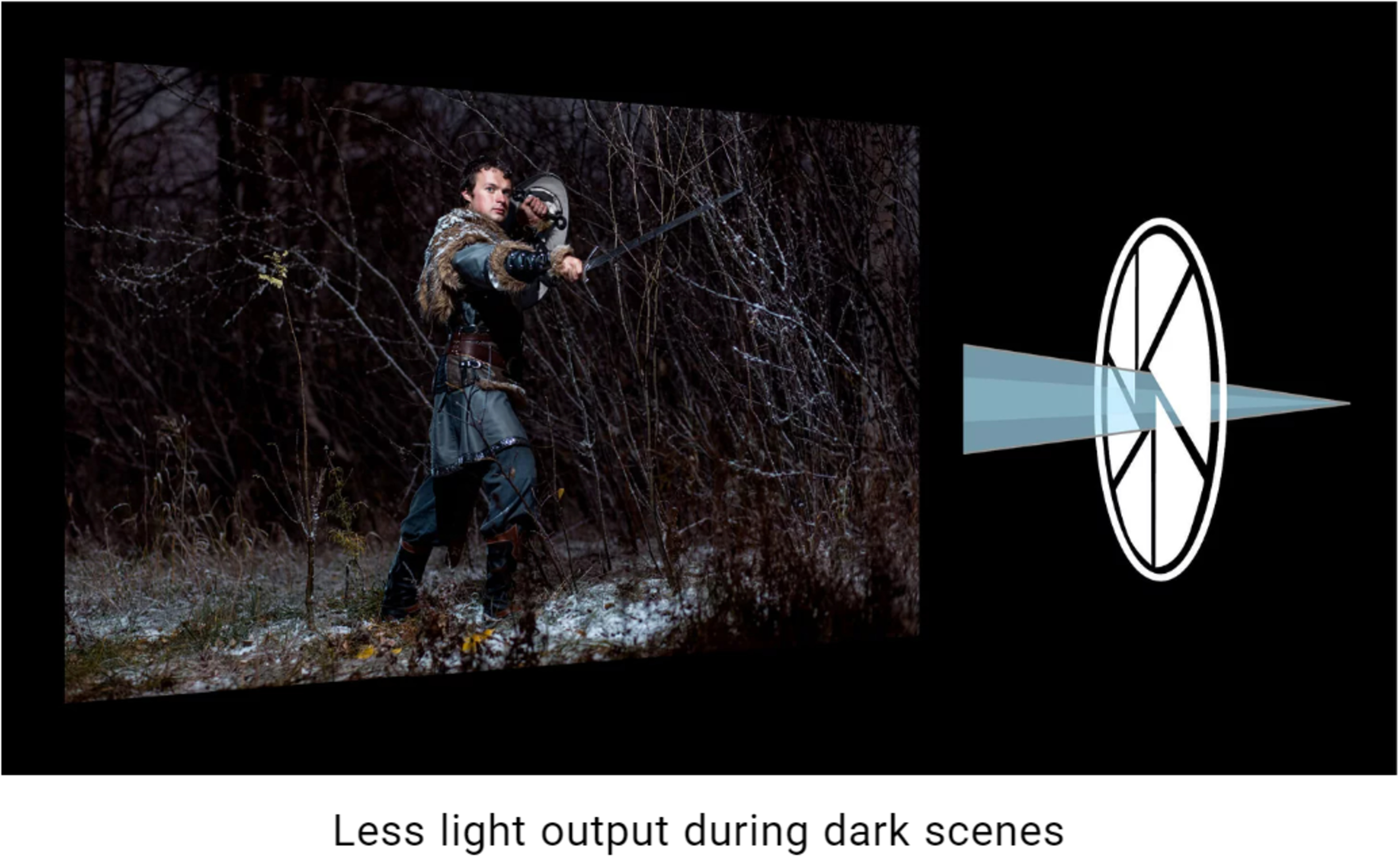 While these features can improve the black levels of a projector in real content, especially in very dim scenes, they inherently lower the brightness of the brighter areas in the same scene, which results in a minimal impact on the scene's contrast.