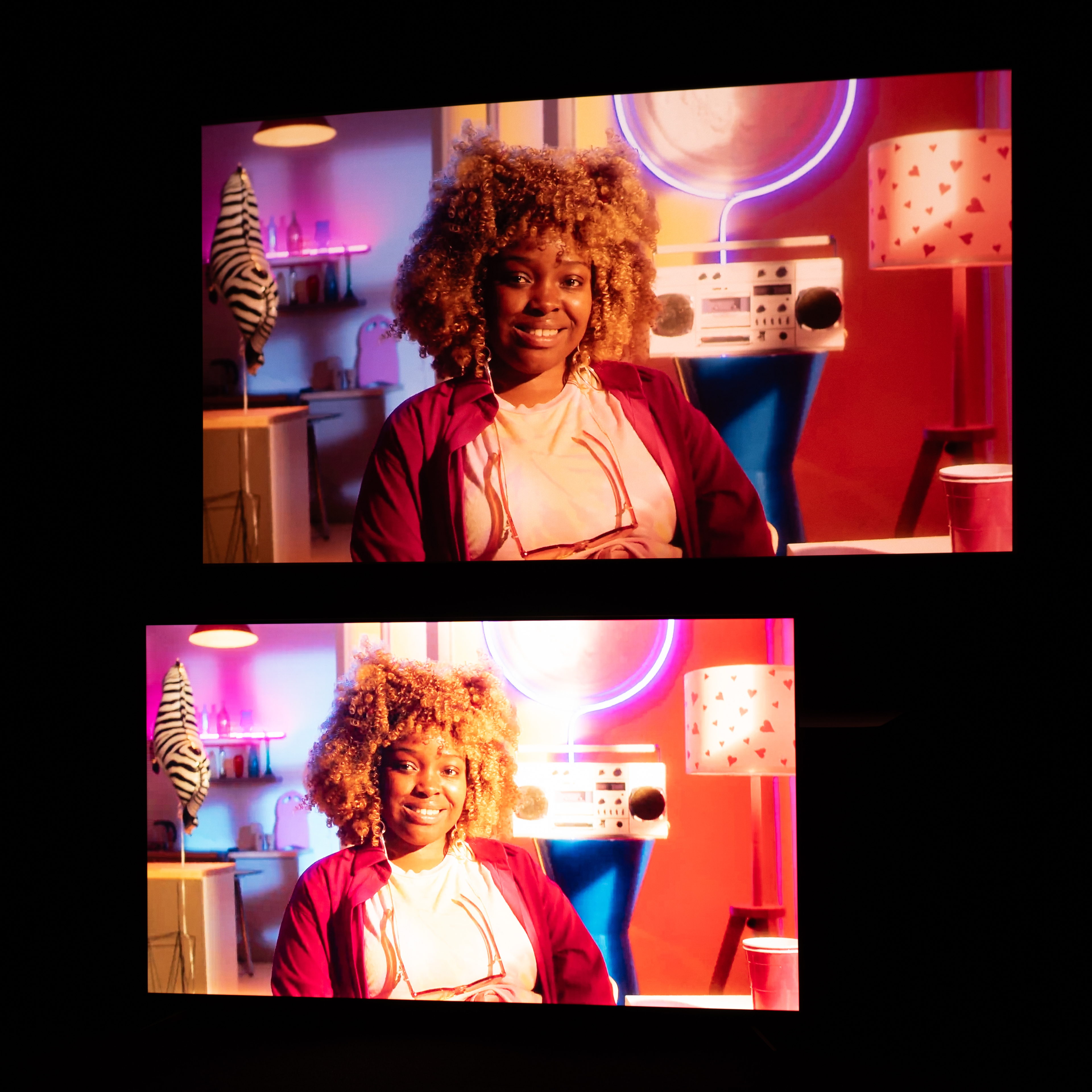 Beyond the brightness, you've likely noticed that the contrast is also substantially better in the marketing picture than what we obtained in our setup (we'll get to this a bit later). It's worth mentioning that by design, emissive displays are much less phased by ambient light than projectors, as seen in the example to the right of the Hisense PX1-PRO projector vs. the TCL 65" Q650G. The picture is a composite of two pictures: one was taken with all lights off in our testing room, while the other had the rear ceiling lights on, like in the picture of the Freestyle 2nd Gen shown above. |