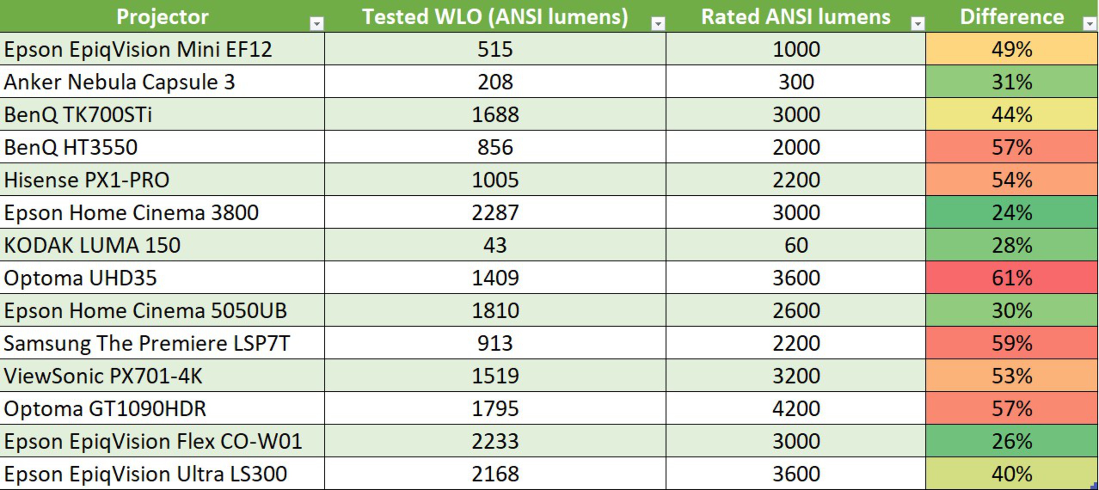 Table of tested WLO (ANSI lumens) compared to the values quoted by manufacturers