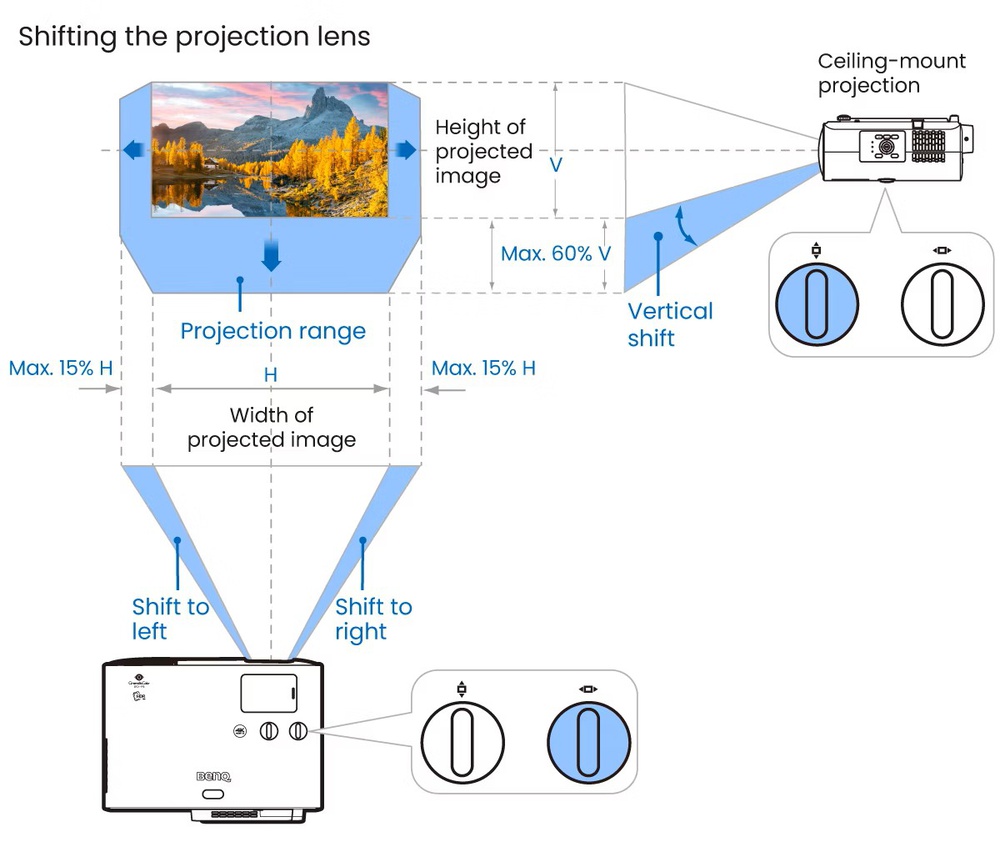 Image size is only one side of placement; final image position is the other. Lens shift is one of the most useful setup features a projector can have because it physically moves the lens vertically and/or horizontally to reposition the image while keeping it straight and properly focused. That makes it very different from keystone correction, which digitally reshapes the image to square it up.