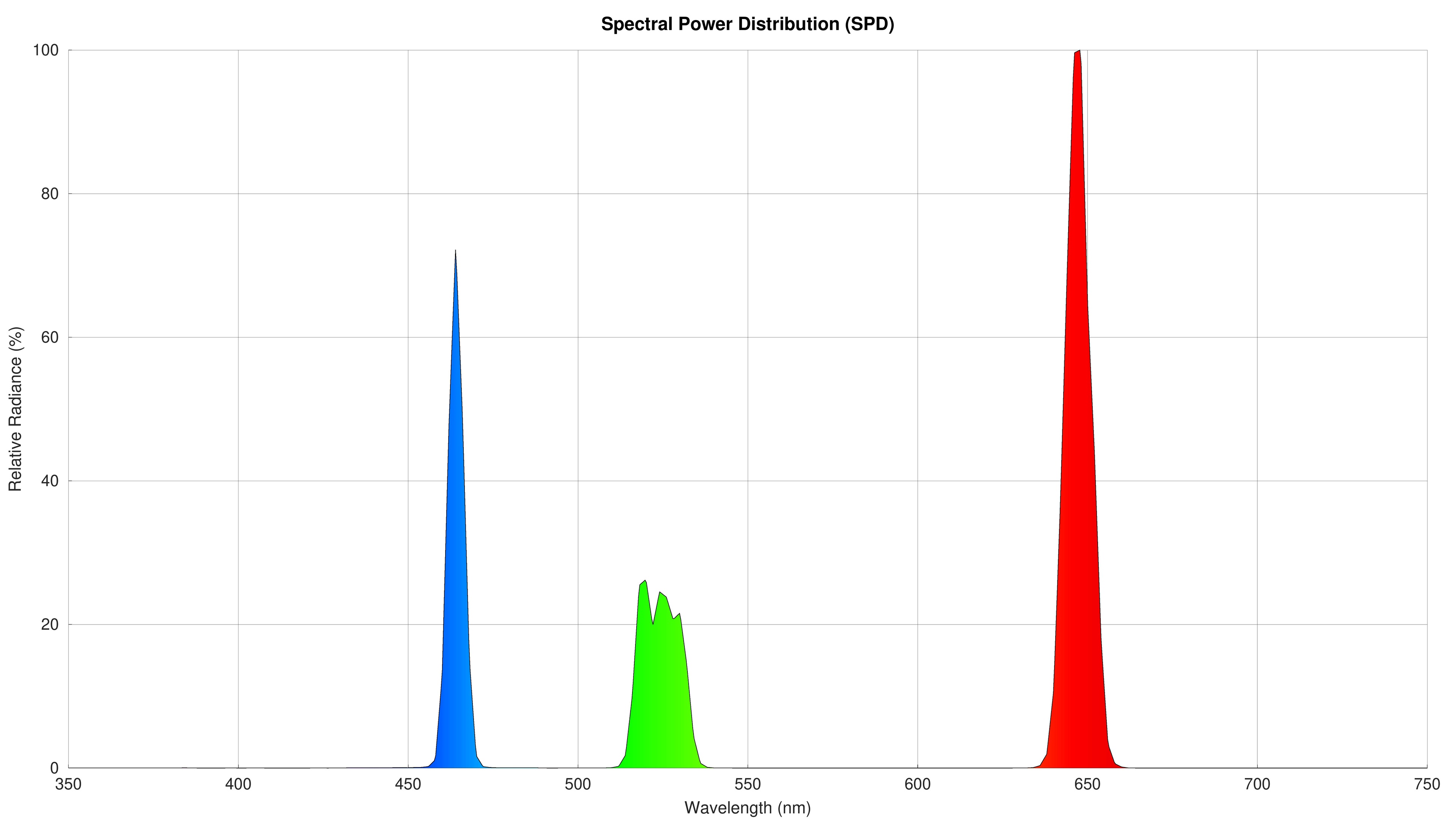 The SPD shows narrow, spike-like red/green/blue peaks typical of RGB laser light engines. In practice, you get very pure primaries and punchy, saturated colors, with minimal long-term dimming, and no lamp replacements. The trade-off is that some screens/rooms may show mild laser speckle.
