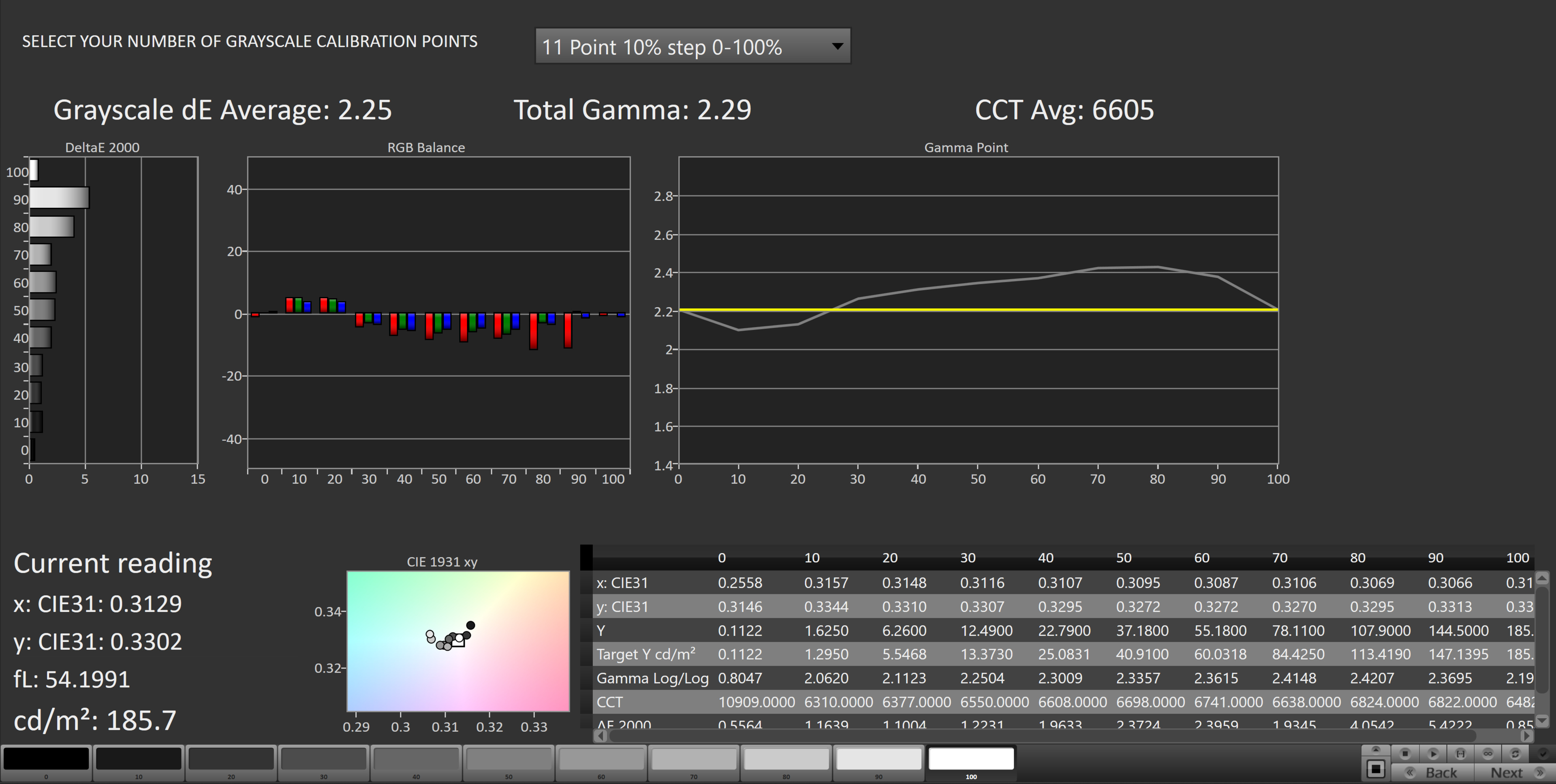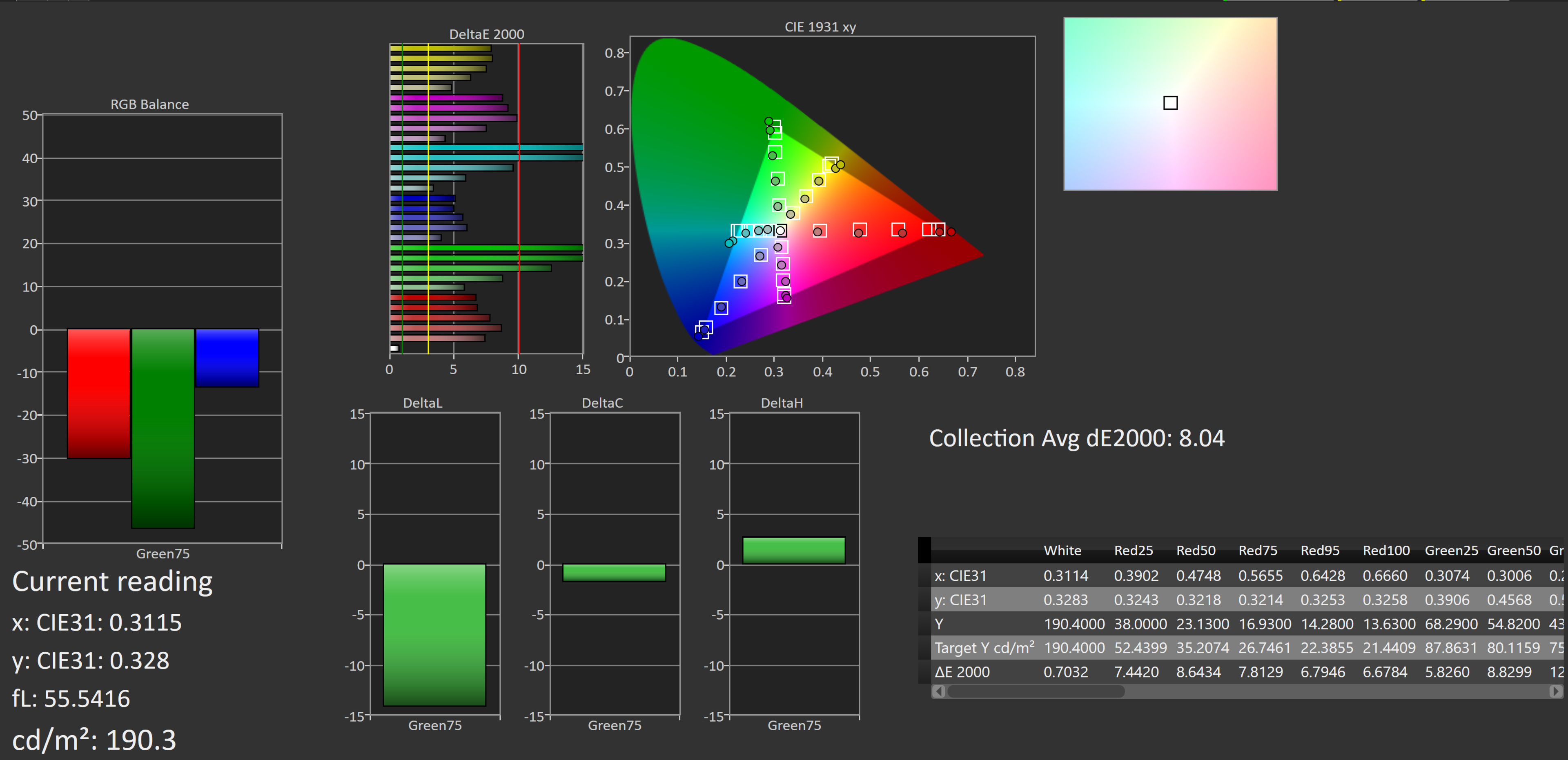 Users who prefer a brighter but less accurate image can enable the 'Brilliant Color' setting. We measured about 106 nits with the setting turned off and ~190 nits with it on. Here are the measurements with the setting on: