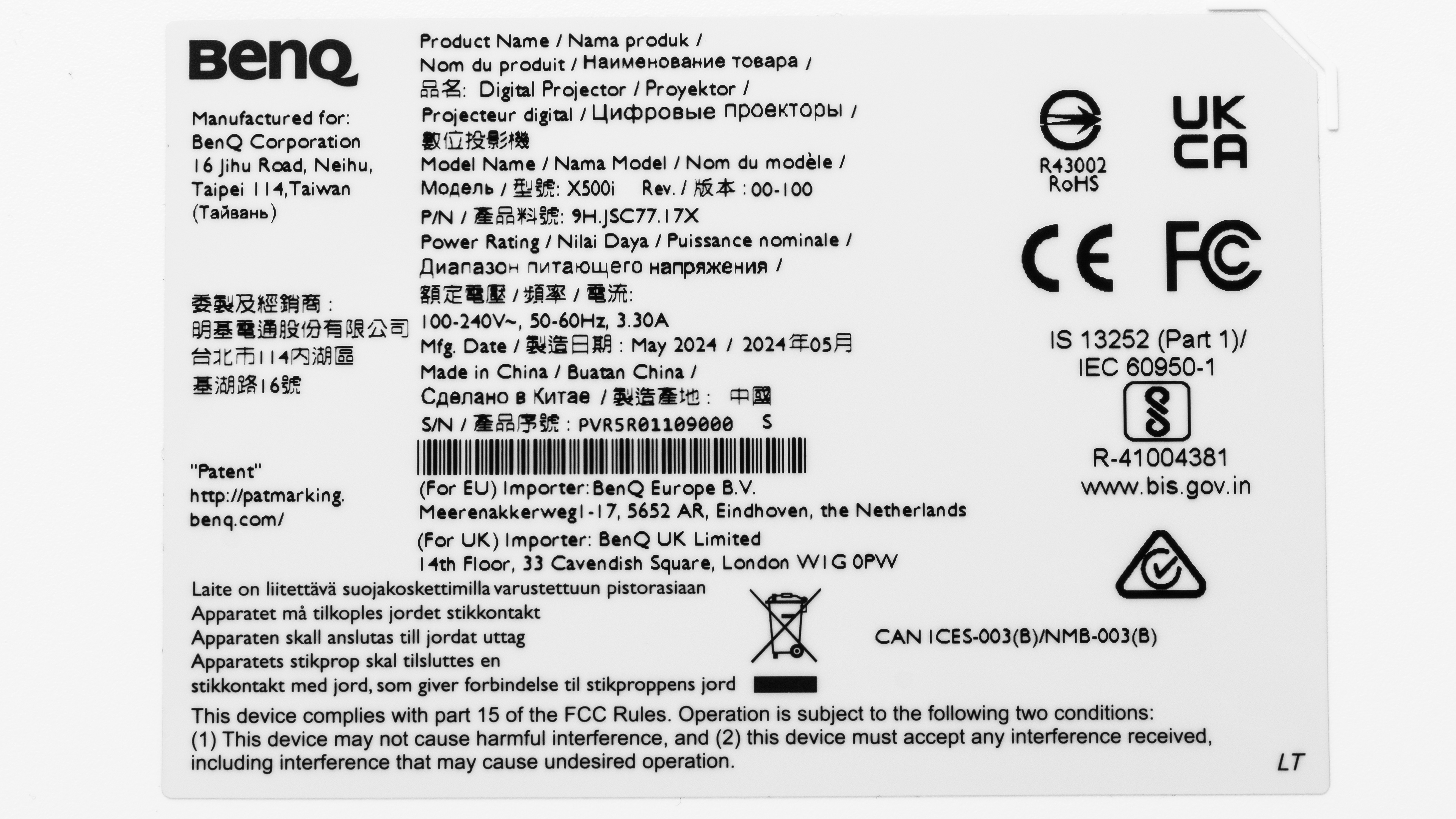 | X500i | 4LED | 4K XPR (DLP) | Short-throw 0.69–0.83; manual zoom | HDR10, HLG | eARC | 240Hz |