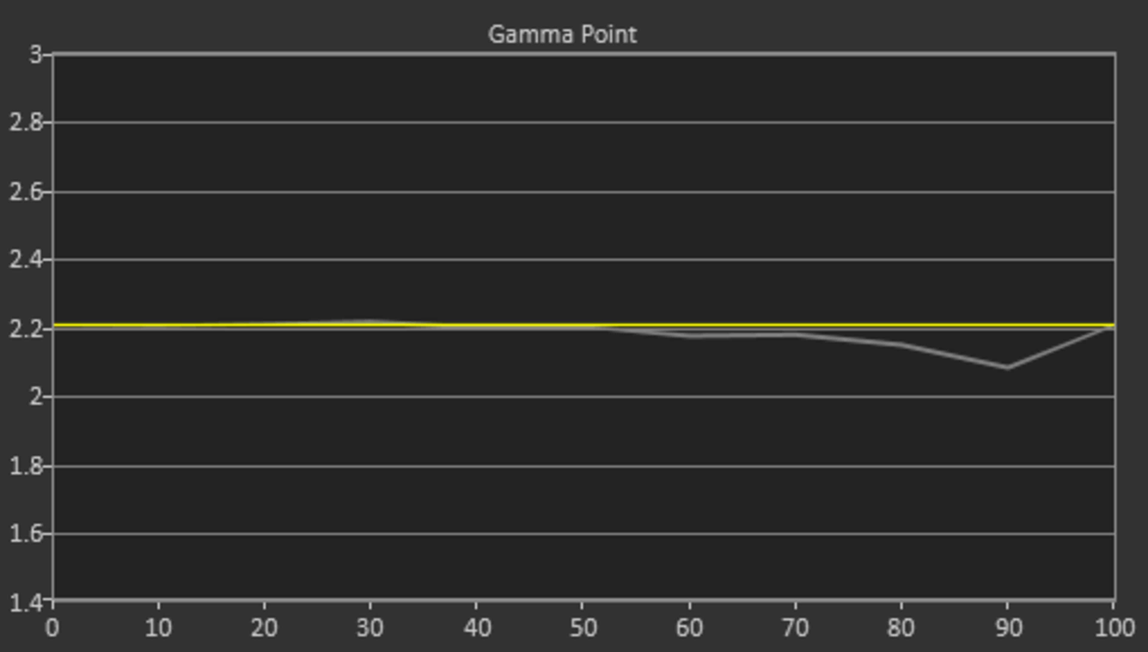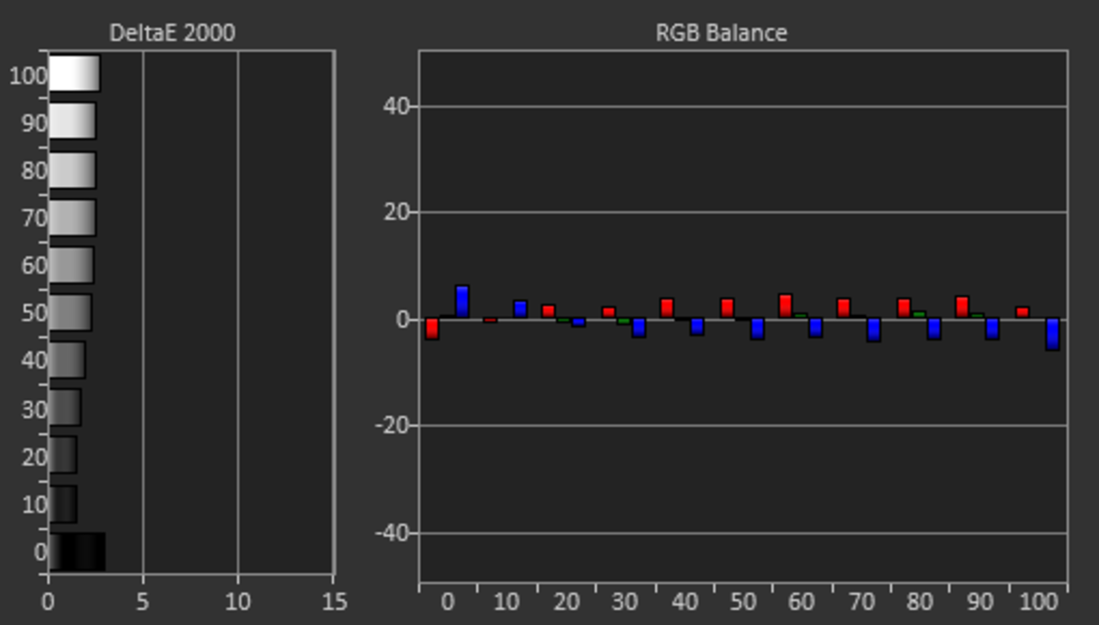 A quick white-balance trim is all it takes to snap the Epson EF21 to neutral, tightening the grayscale and removing the mild warmth you see out of the box. The projector doesn't have any color adjustments, so you won't chase perfection on every saturated point here, but you don't need to: once grayscale is corrected, colors mostly fall into place, and the image looks clean and cohesive. Still, the unit's saturated blues, greens, and yellows still struggle, but most people won't notice it.