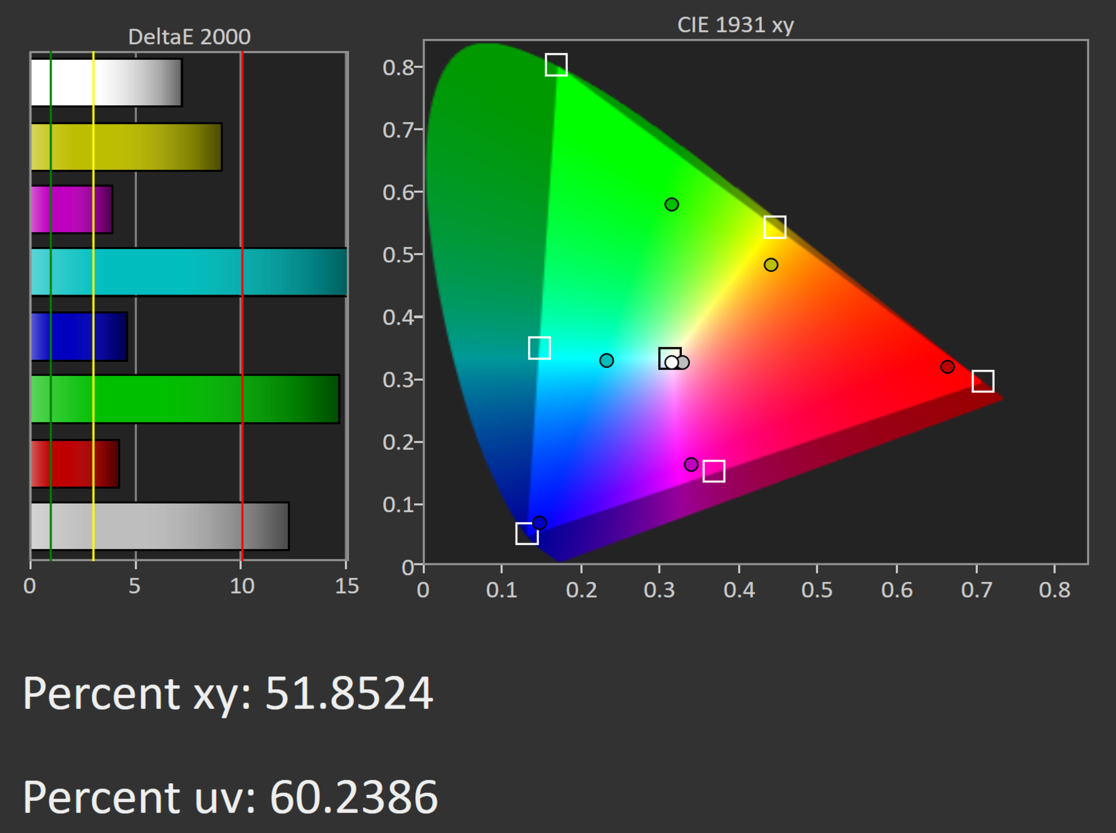 As for Rec. 2020, the unit has some quirks. While we would normally use the 'Movie' Picture Mode, on this projector, that mode clamps the Rec. 2020 signal to Rec. 709, thus undersaturating almost every color. To render proper Rec. 2020, we had to use the 'Vivid' Picture Mode. In Vivid, the projector displays almost the entirety of the Rec. 2020 color space, and most colors are close to what they should be, although whites and especially grays do noticeably diverge from their target.