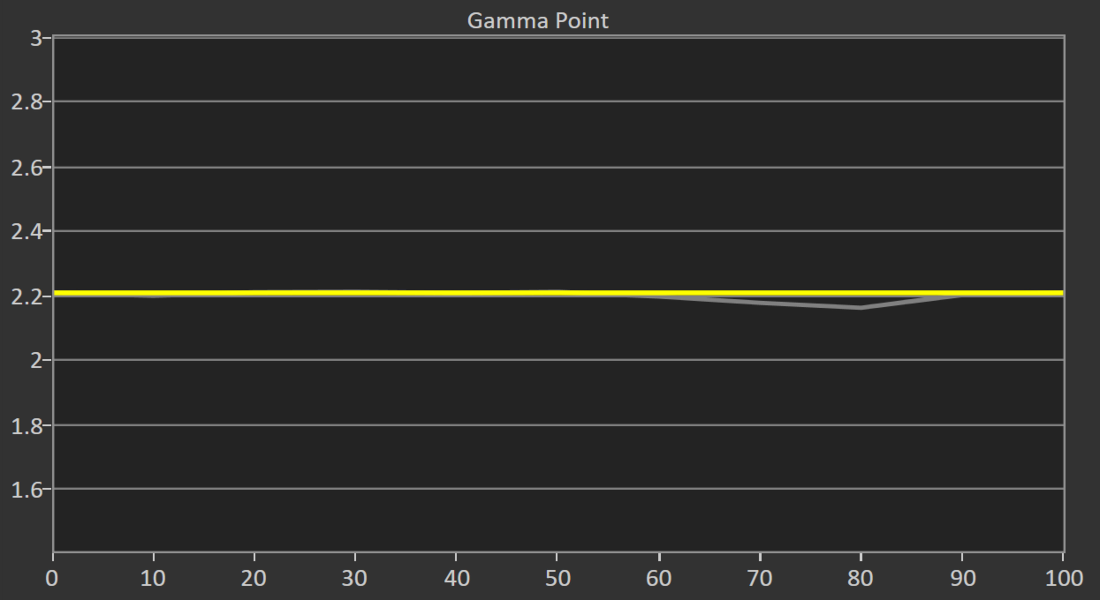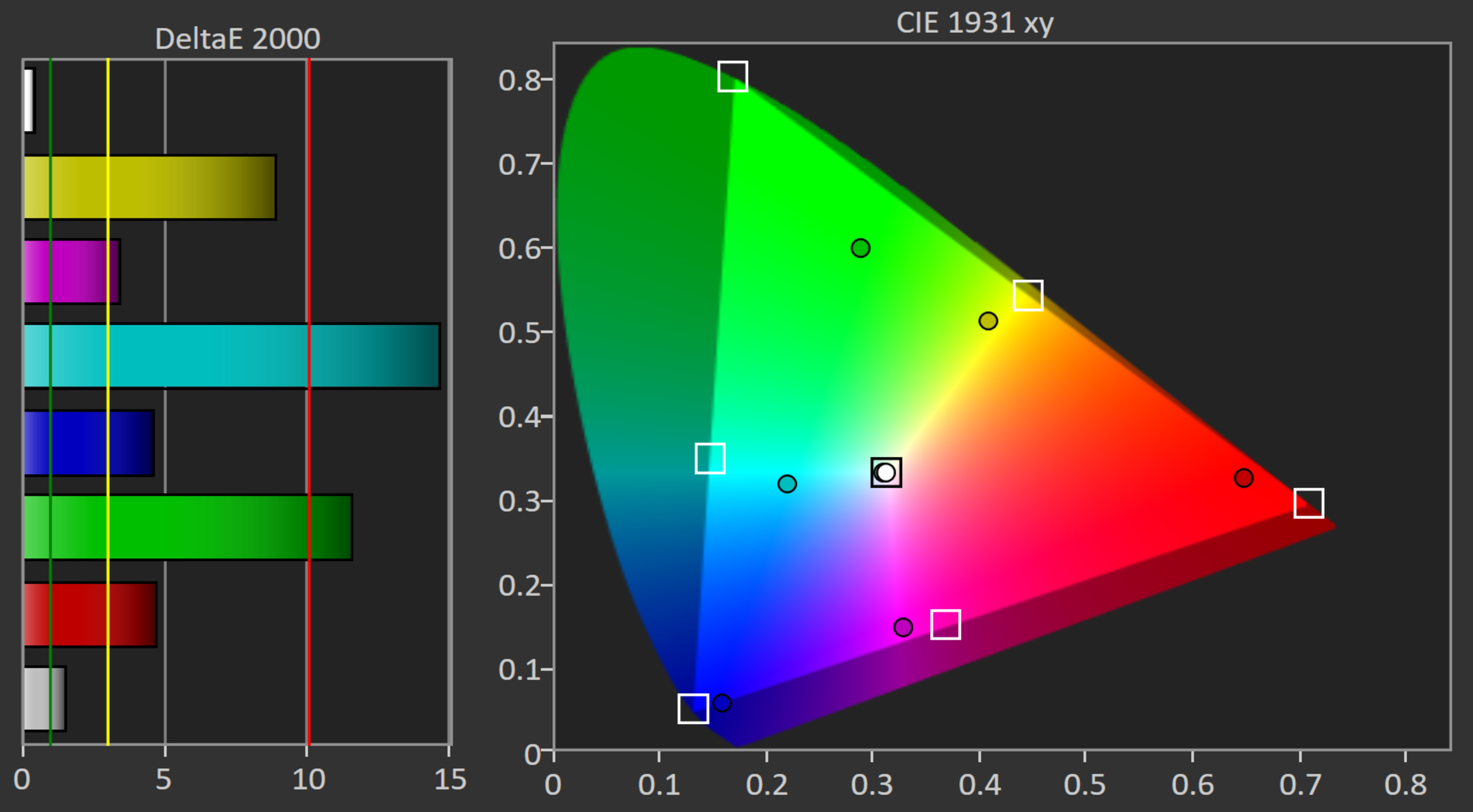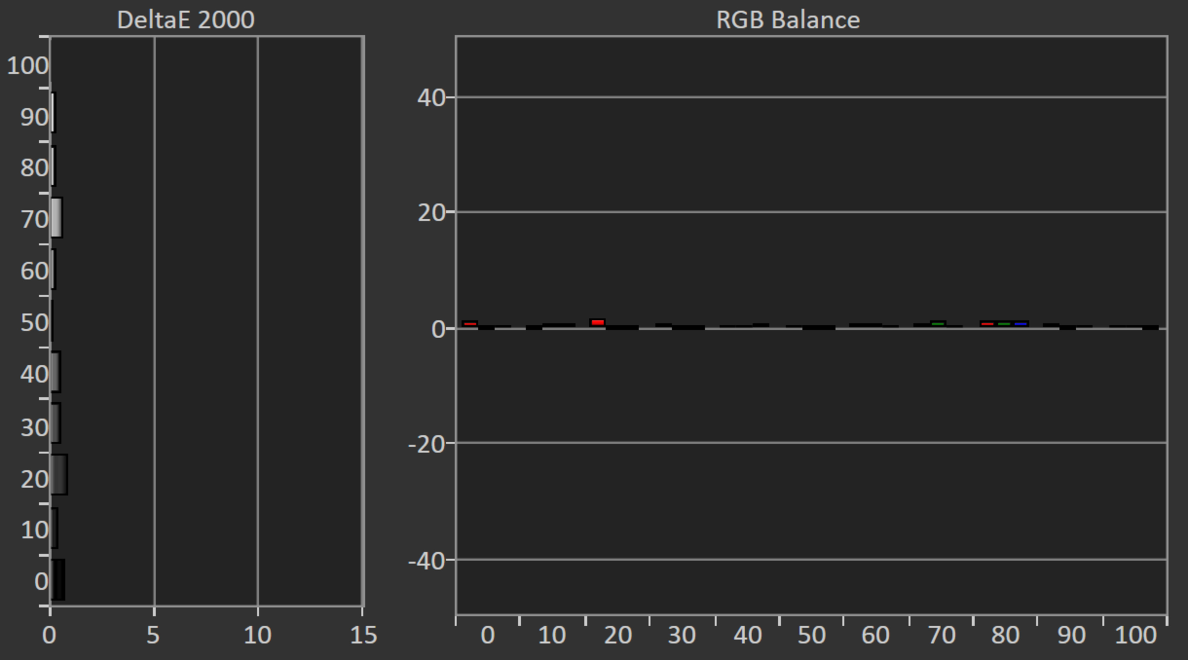 After calibration, the NexiGo TriVision Ultra 4k Tri-LED Laser Projector cleans up beautifully. Grayscale lands right on target with neutral-looking whites and very even RGB tracking, so there's no lingering blue tint. Gamma hugs our 2.2 target across the range, which helps preserve shadow detail without washing out highlights. Color accuracy also mostly snaps into place: skin tones look natural, and most hues fall within a just-noticeable difference of reference.
