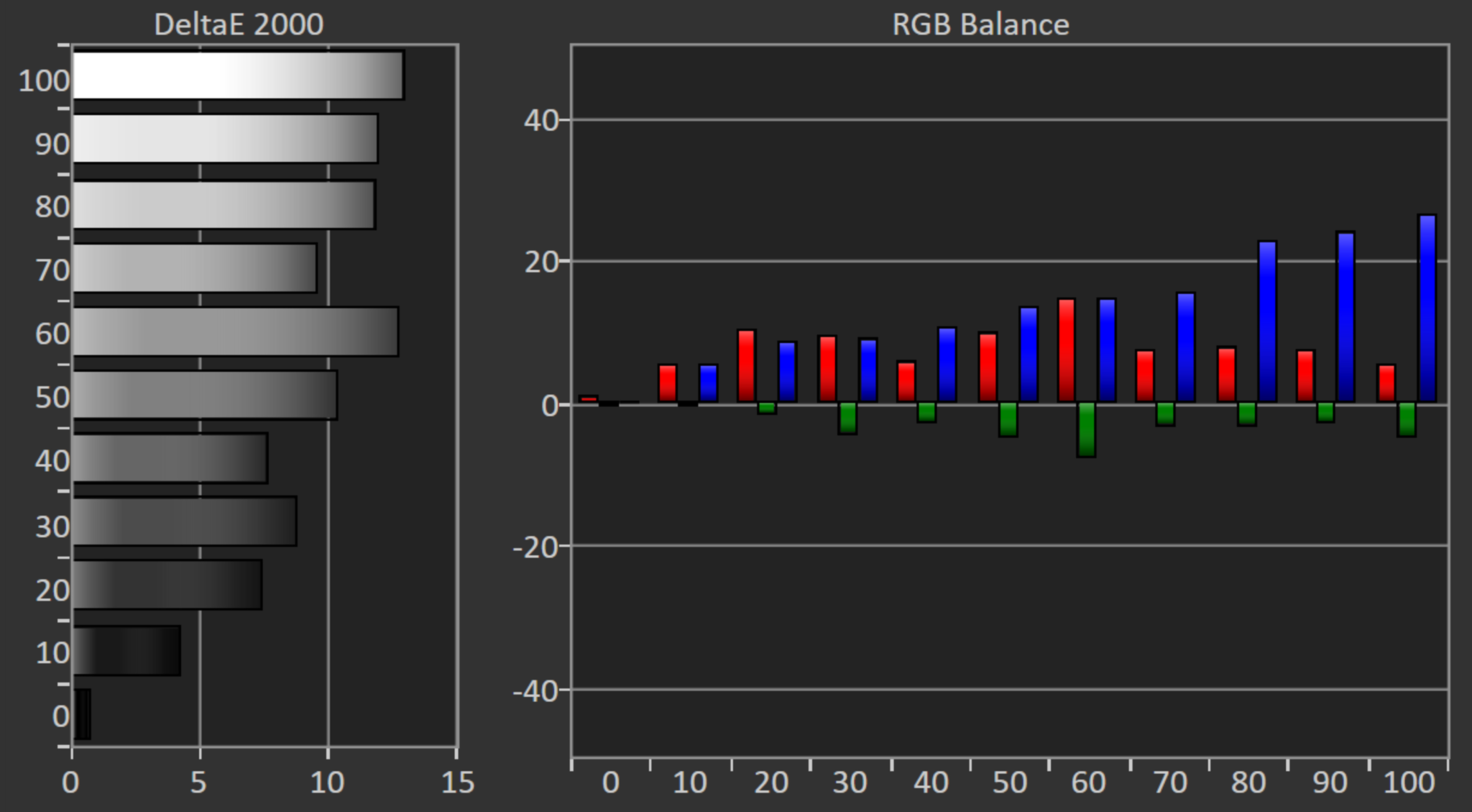 The NexiGo TriVision Ultra's image accuracy is quite poor right out of the box. The unit's grayscale skews cool because blue is overrepresented, with red also slightly overrepresented, so whites pick up a bluish cast. Color accuracy is poor overall, as most colors have a fair amount of color mapping issues. The color temperature is relatively stable for a projector, but sits noticeably above 6500K, reinforcing that cool tint.