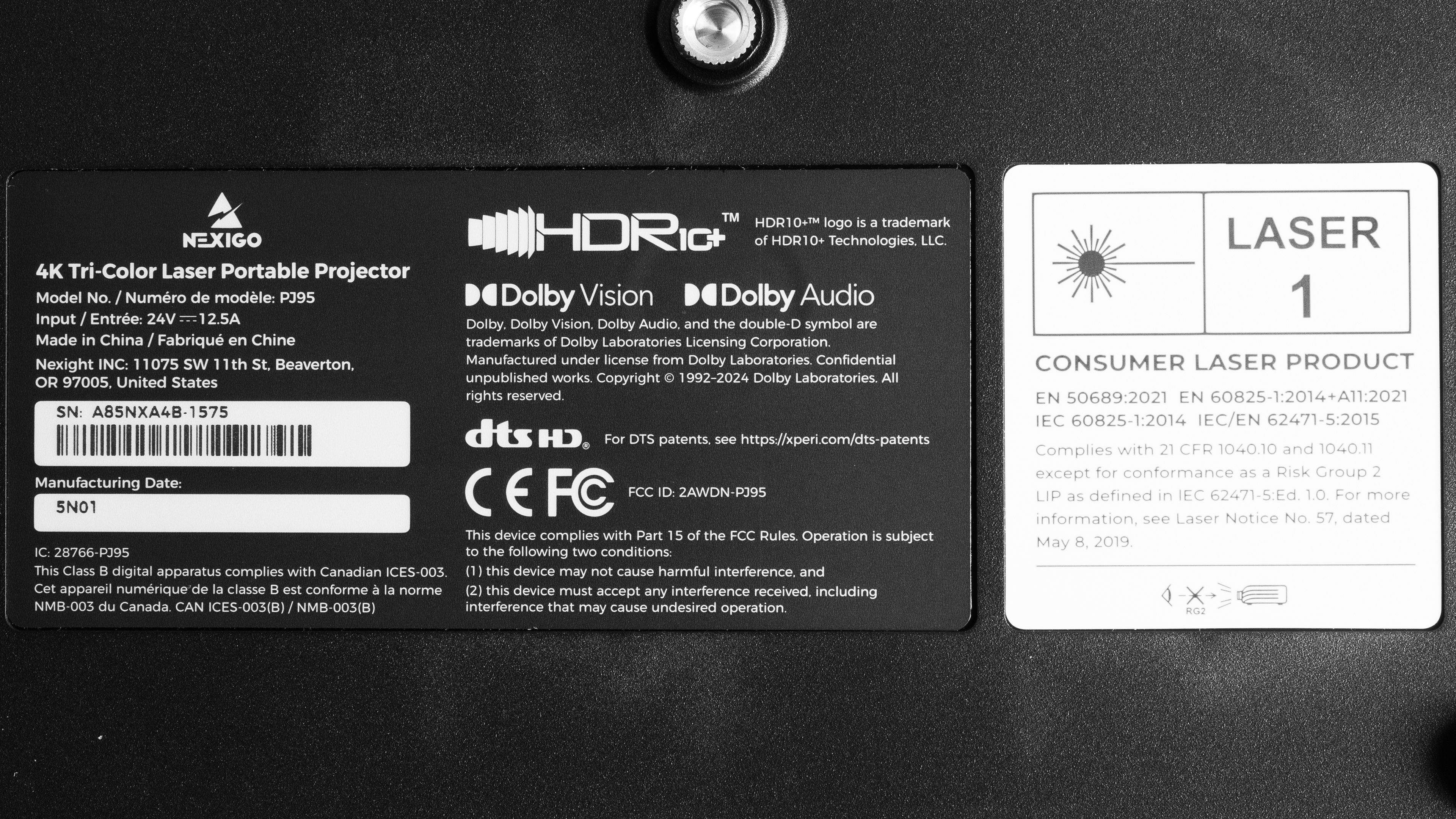 The NexiGo TriVision Ultra is a long-throw 4k XPR DLP projector that uses a tri-LED-laser light engine. It's advertised at 2,600 lumens and a 1.27:1 throw ratio, with a recommended 80- to 150-inch image (supports up to 300 inches). Feature support includes Dolby Vision, HDR10+, HDR10, and HLG, plus active 3D. Smart screen-adaptation items are also onboard and include autofocus, auto-keystone, auto screen-fit, obstacle avoidance, eye protection, and adaptive brightness. For sound, it has dual 15W speakers with Dolby Audio and DTS Virtual:X. Connectivity includes three HDMI 2.1 inputs with eARC on HDMI 1, one USB-A, one Micro-USB, S/PDIF optical out, a 3.5 mm line-out, RJ-45 Ethernet, Wi-Fi 6, Bluetooth 5.2, screen casting, and a backlit IR/Bluetooth remote. It weighs about 11 pounds and comes with a built-in handle for carrying.