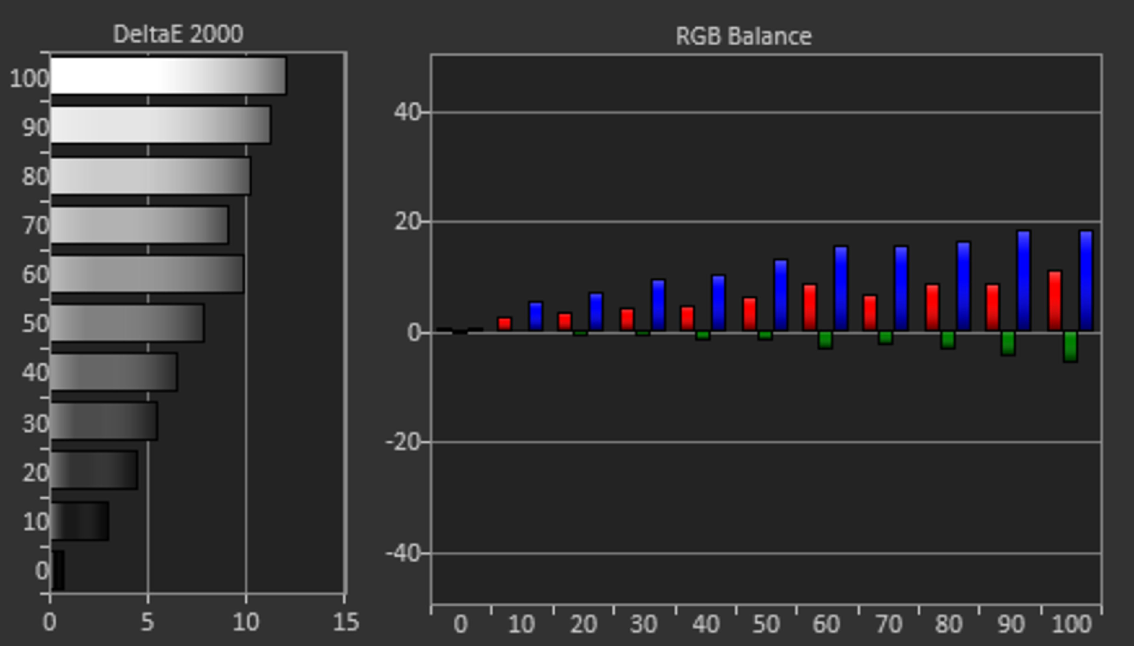 There are two color temperature settings on this projector: one called Color Temperature and the other called Picture Color Temperature. Our tests are with Color Temperature set to 'Standard', and Picture Color Temperature set to 'Warm'. Doing it any other way makes gamma worse. The color space also had to be manually set to Rec. 709, as all other color spaces returned less accurate results.