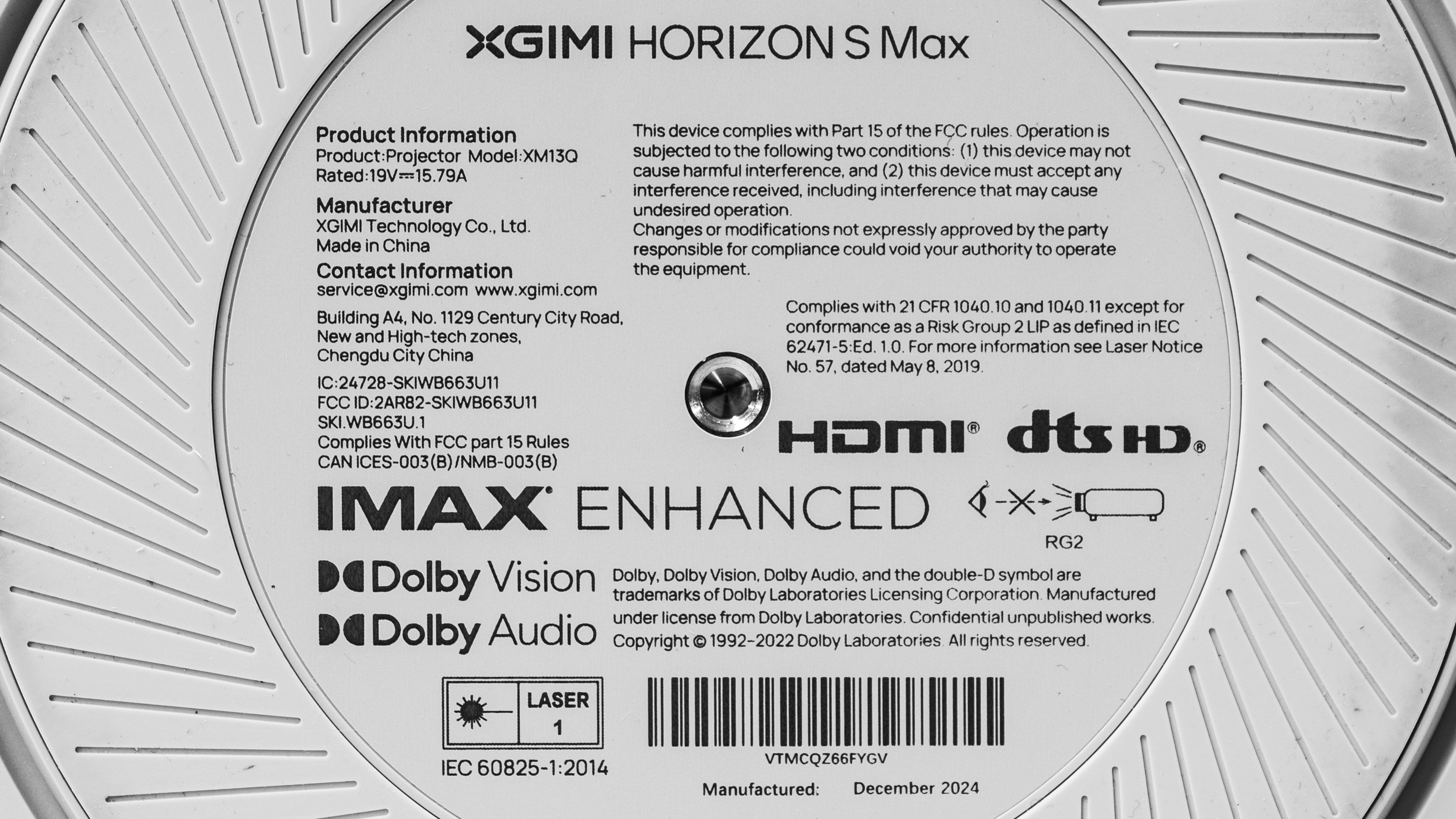 The XGIMI Horizon S Max is a long-throw 4k XPR DLP projector built around XGIMI's Dual Light 2.0 tri-laser + LED engine. It supports Dolby Vision, HDR10, HLG, and IMAX Enhanced and adds ISA 5.0 setup features, which include uninterrupted auto-keystone/autofocus, obstacle avoidance, screen alignment, and wall-color adaptation, plus a flexible built-in stand and an electric sliding lens cover. It runs Android TV 11 with Google Cast, includes 64 GB storage, and uses dual 12W Harman/Kardon speakers. The fixed 1.2:1 throw covers 40–200 inches; that's roughly ~3.5 ft (40 inches) to ~17.4 ft (200 inches). Connectivity includes Wi-Fi 5, Bluetooth 5.1, HDMI (eARC), and two USBs.