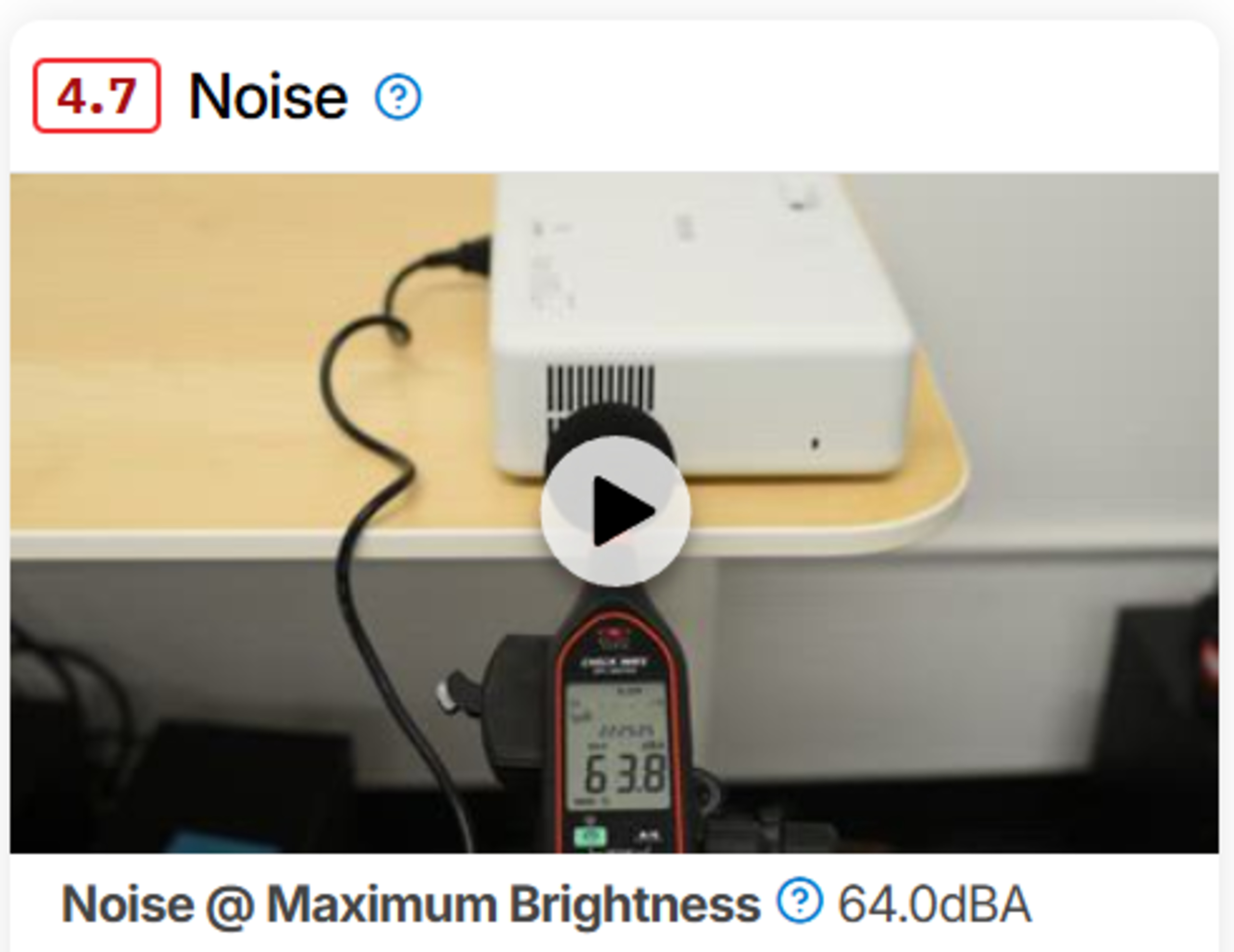 - We measure SPL (dBA) at max brightness at a fixed distance and orientation.
