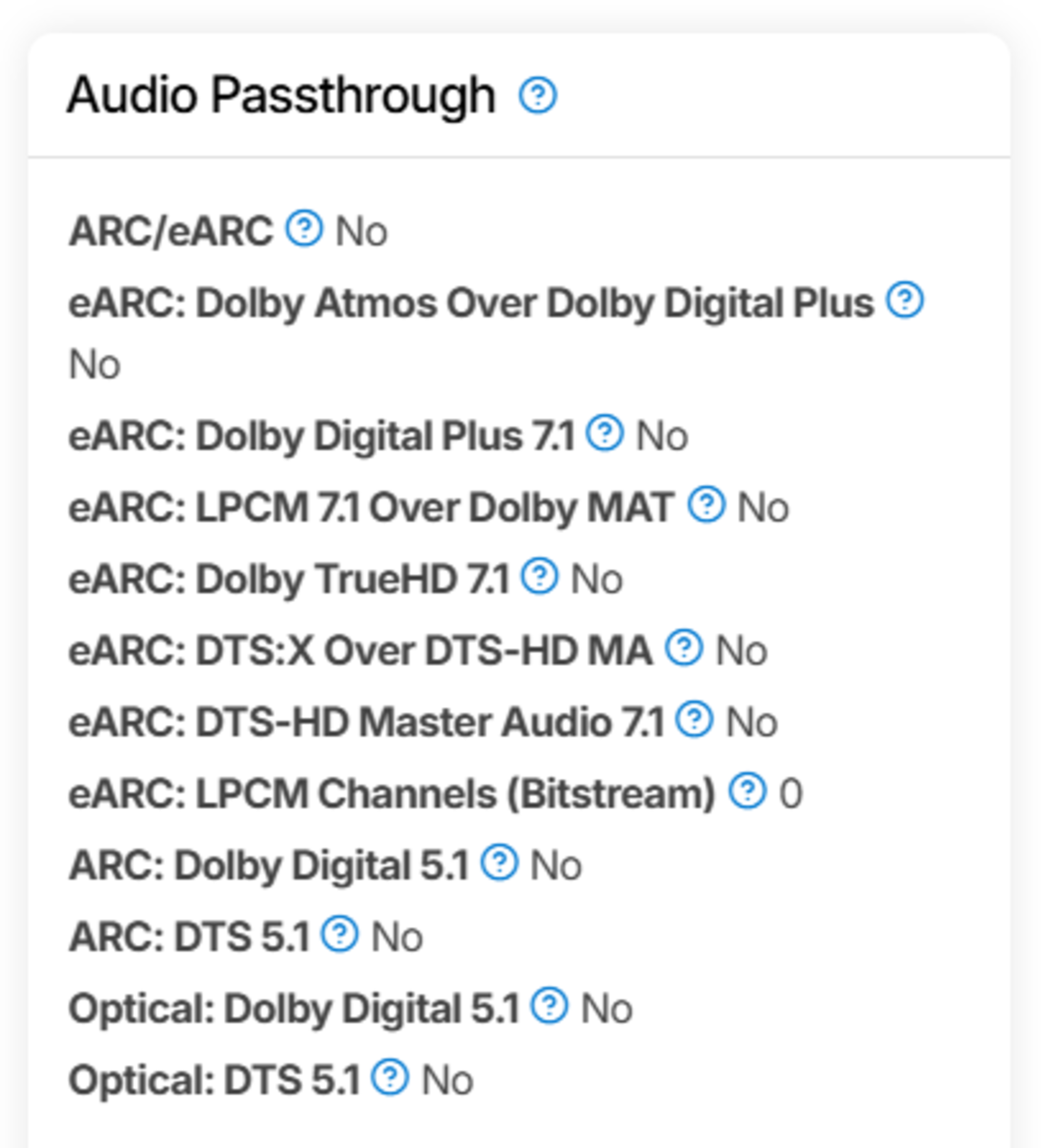 - Audio Passthrough (eARC/ARC and optical behavior, including object-based formats).