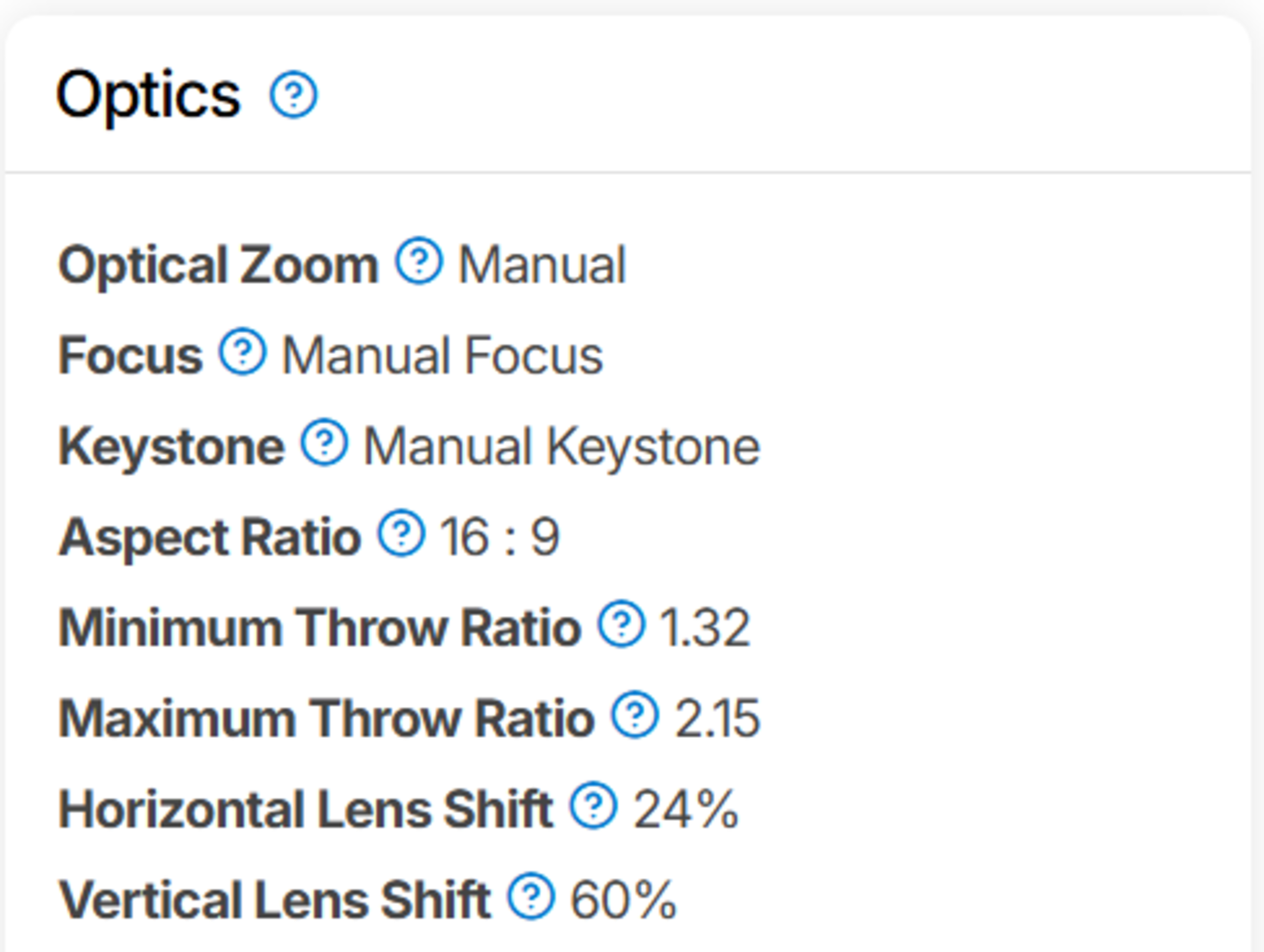 - Optics box (zoom/focus/keystone, throw ratios, lens shift, and practical throw-distance ranges).