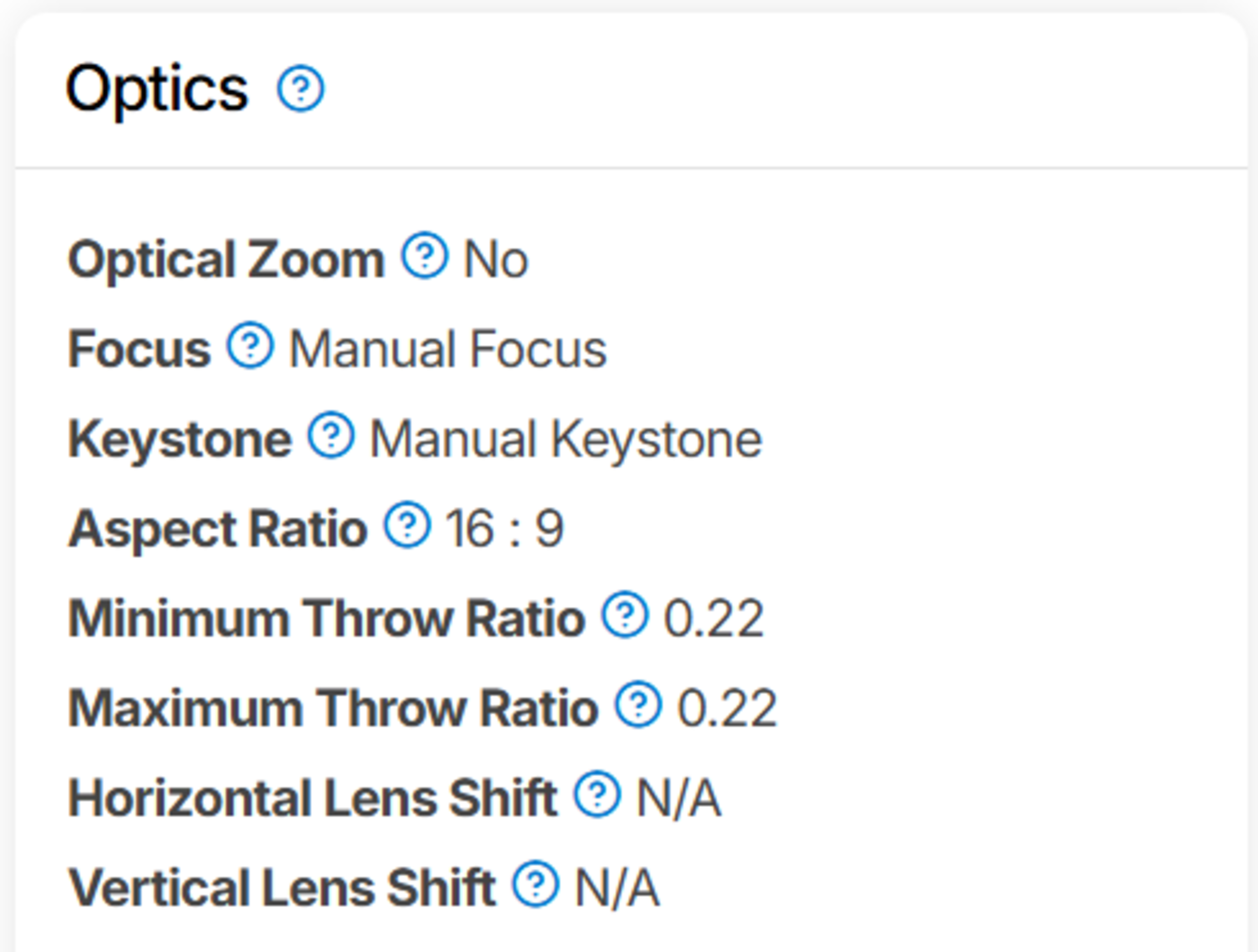 - Reports optical zoom, focus type, keystone, throw ratio range, and lens shift (with practical throw-distance examples for common screen sizes).