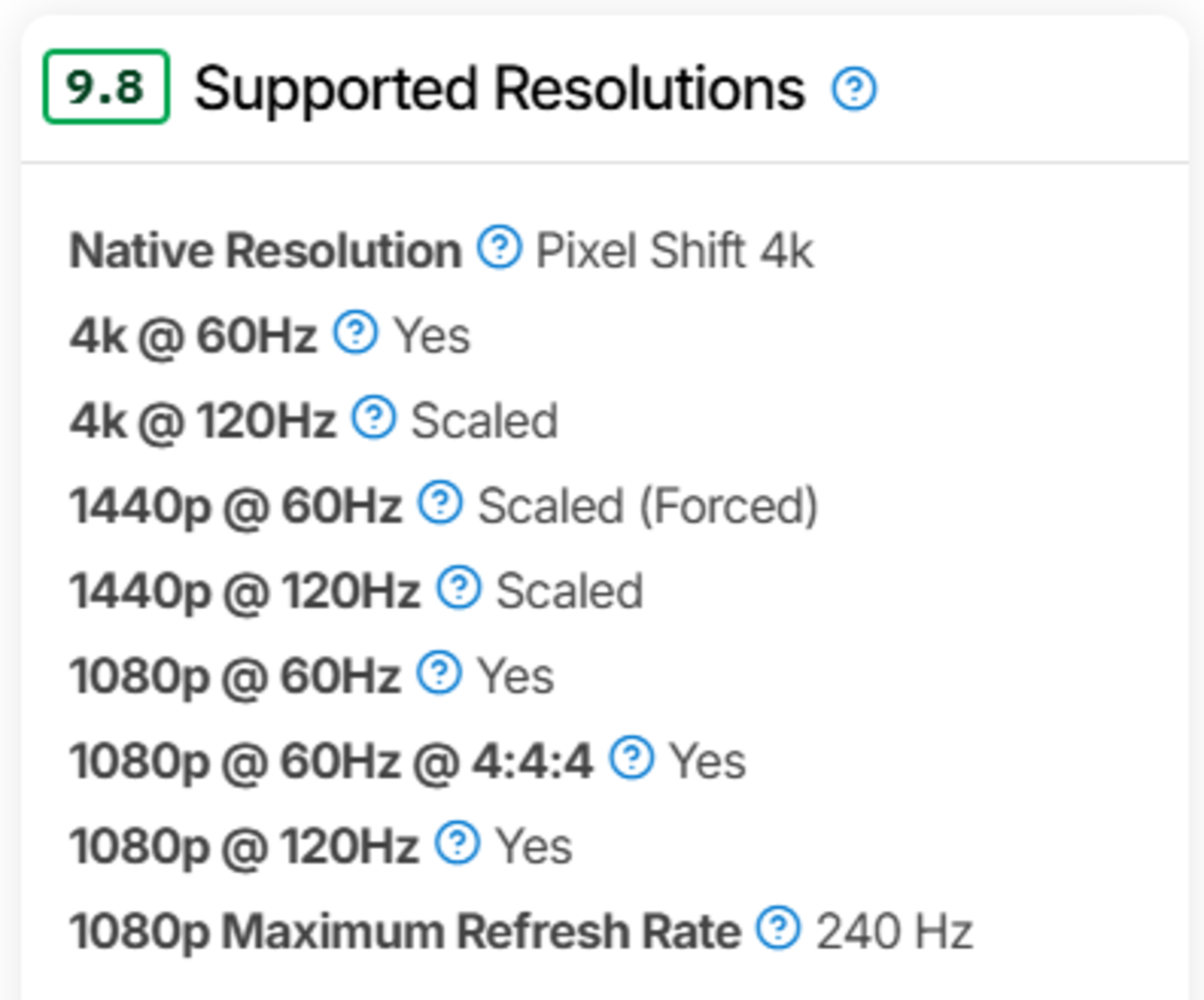 - Supported Resolutions (PC & console refresh/format matrix).