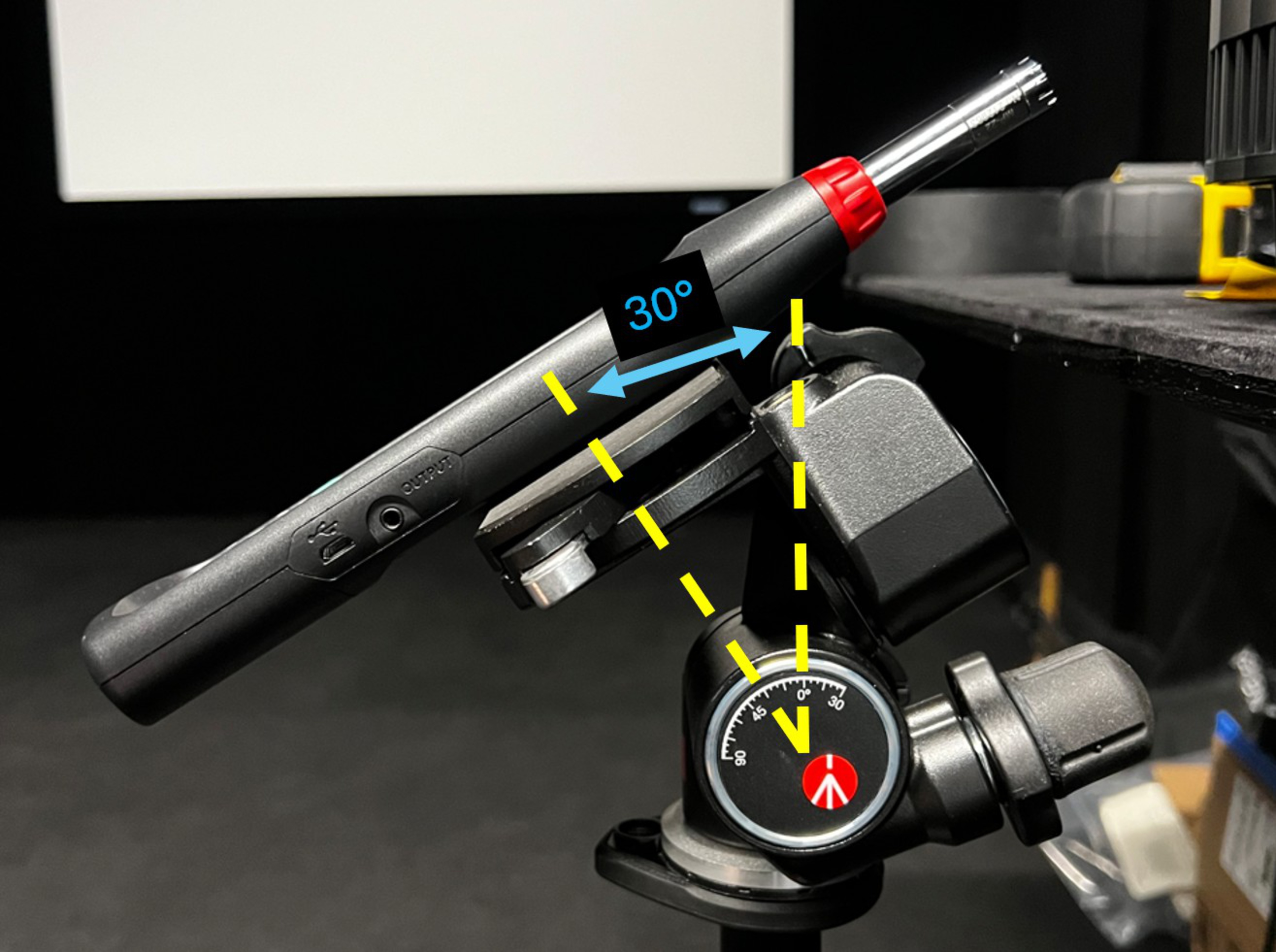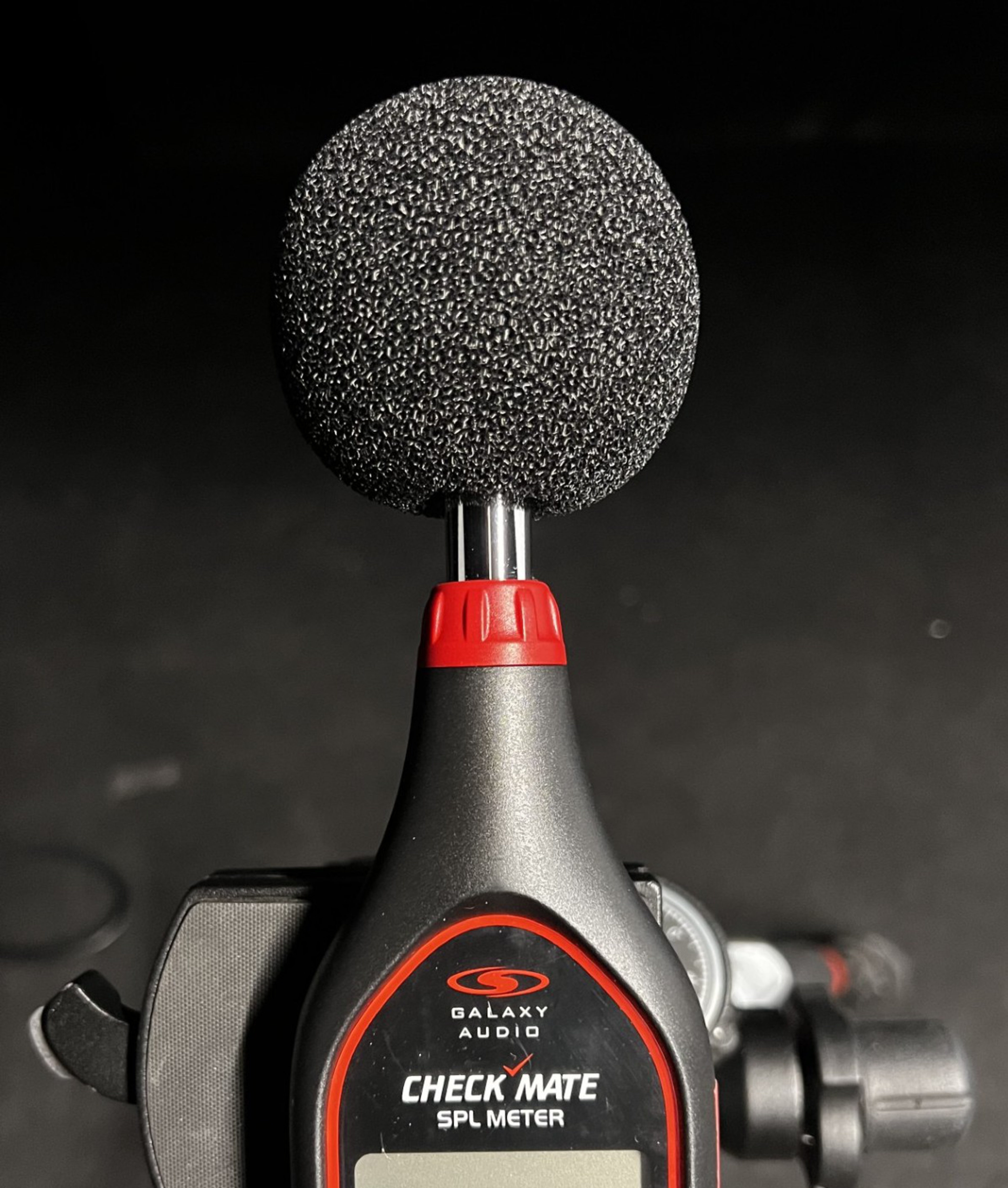 Our tests are done using a Galaxy Audio CM-170 Sound Pressure Level Meter. We mount the SPL meter on a tripod and set it directly in front of the projector's exhaust grille, at a fixed distance of 5 cm and a 30-degree angle (left image). We attach a windshield to the tip of the SPL meter to reduce noise from the moving air expelled from the exhaust grille (right image).