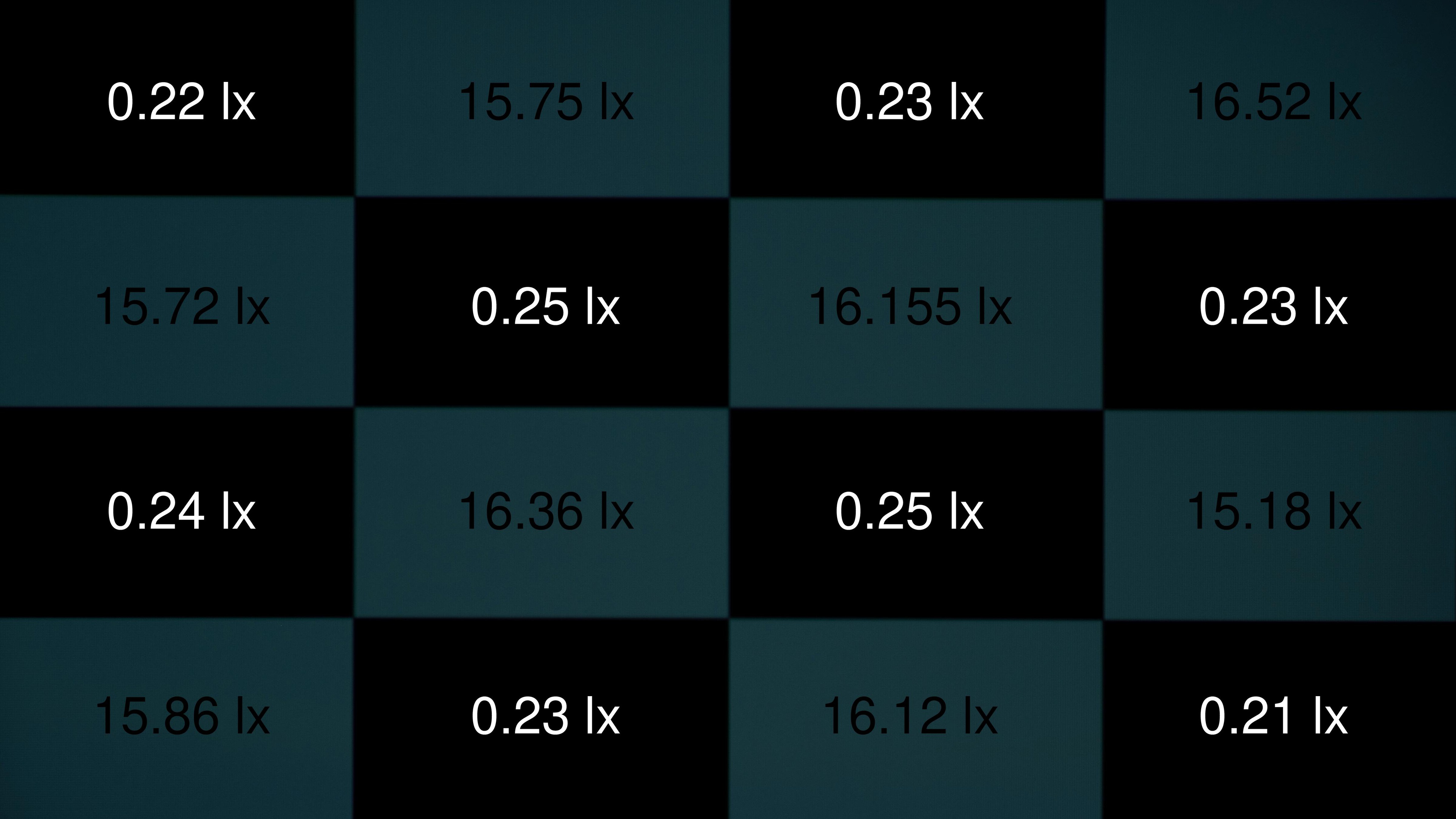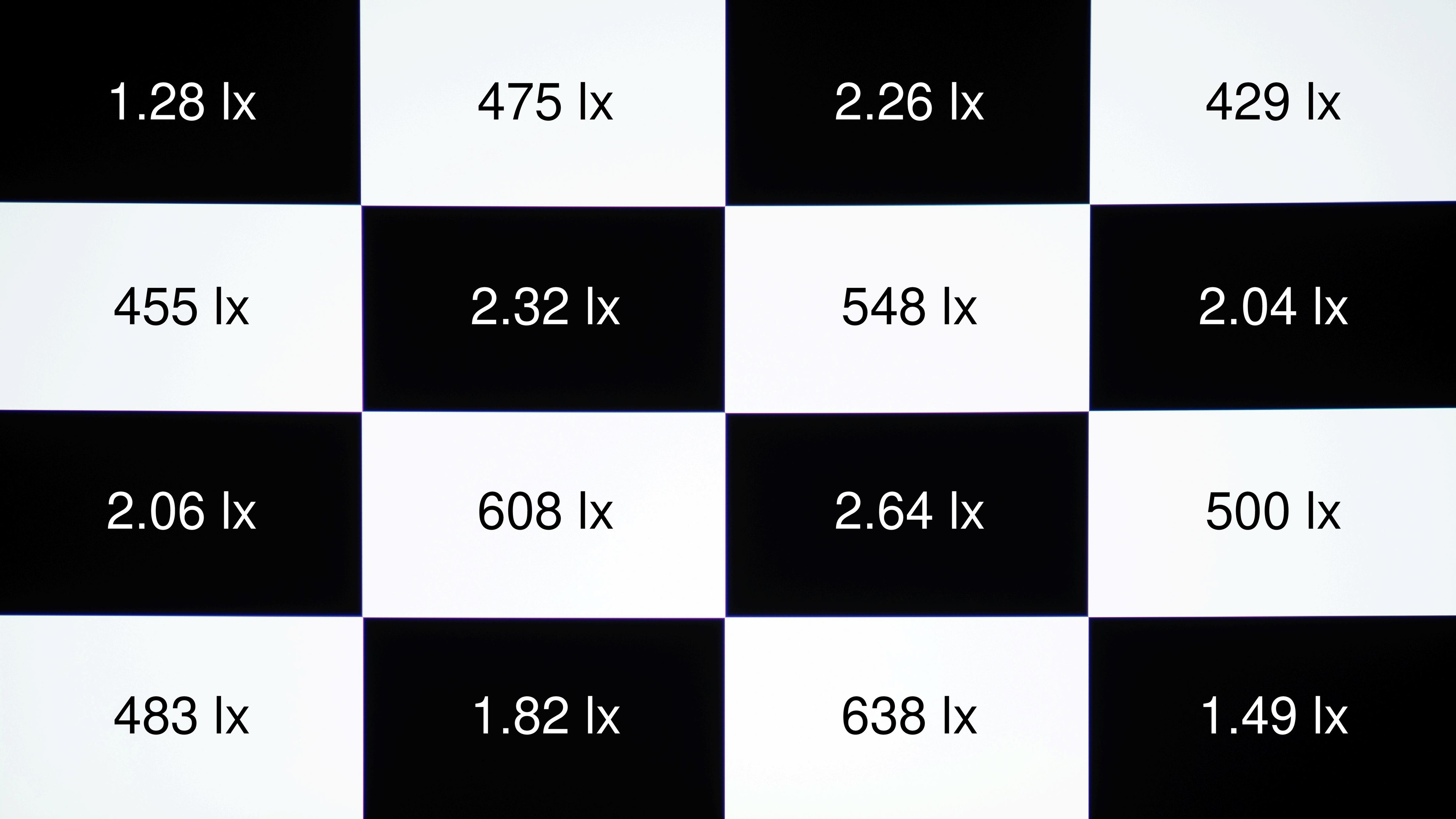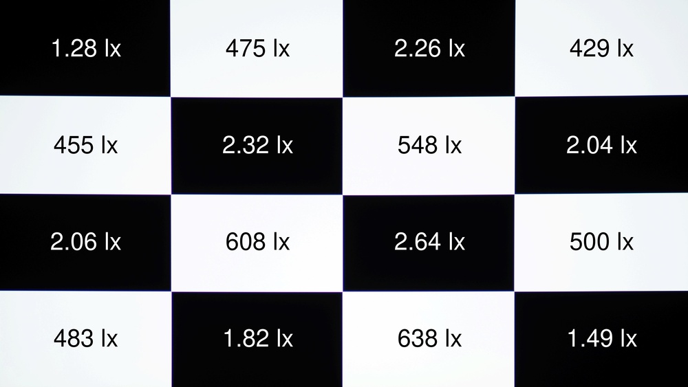 To arrive at a final contrast measurement, we take the average of the white squares and divide it by the average of the black squares. We also take a picture of the checkboard pattern on the screen and overlay our measurements on the image to give you a sense of the black-and-white illuminance uniformity across the screen.