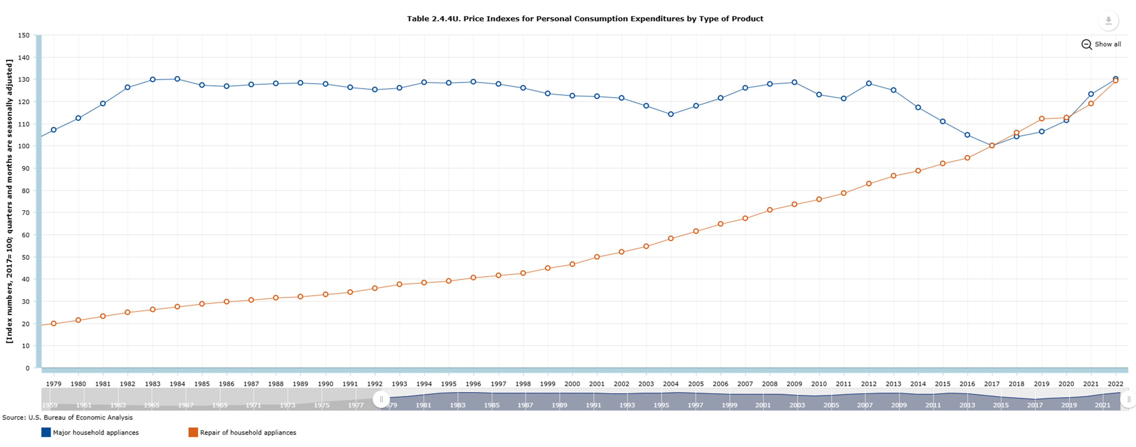 Without hypothesizing around planned obsolescence, a simpler explanation would be the cost of appliance repair that has skyrocketed in recent years.