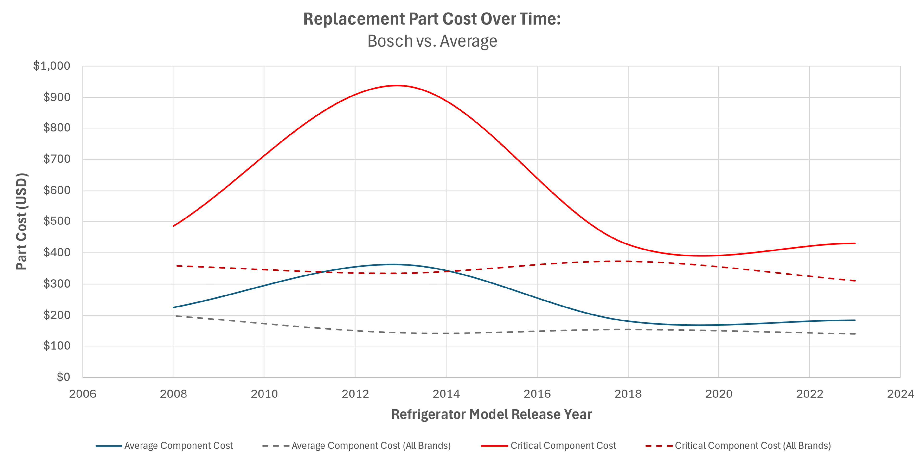 Additionally, average part prices are higher across the board (not surprising given that Bosch refrigerators usually have a higher price tag), but their critical component cost is well above the industry average in later years, making replacement more feasible than repair for models older than 10 years.