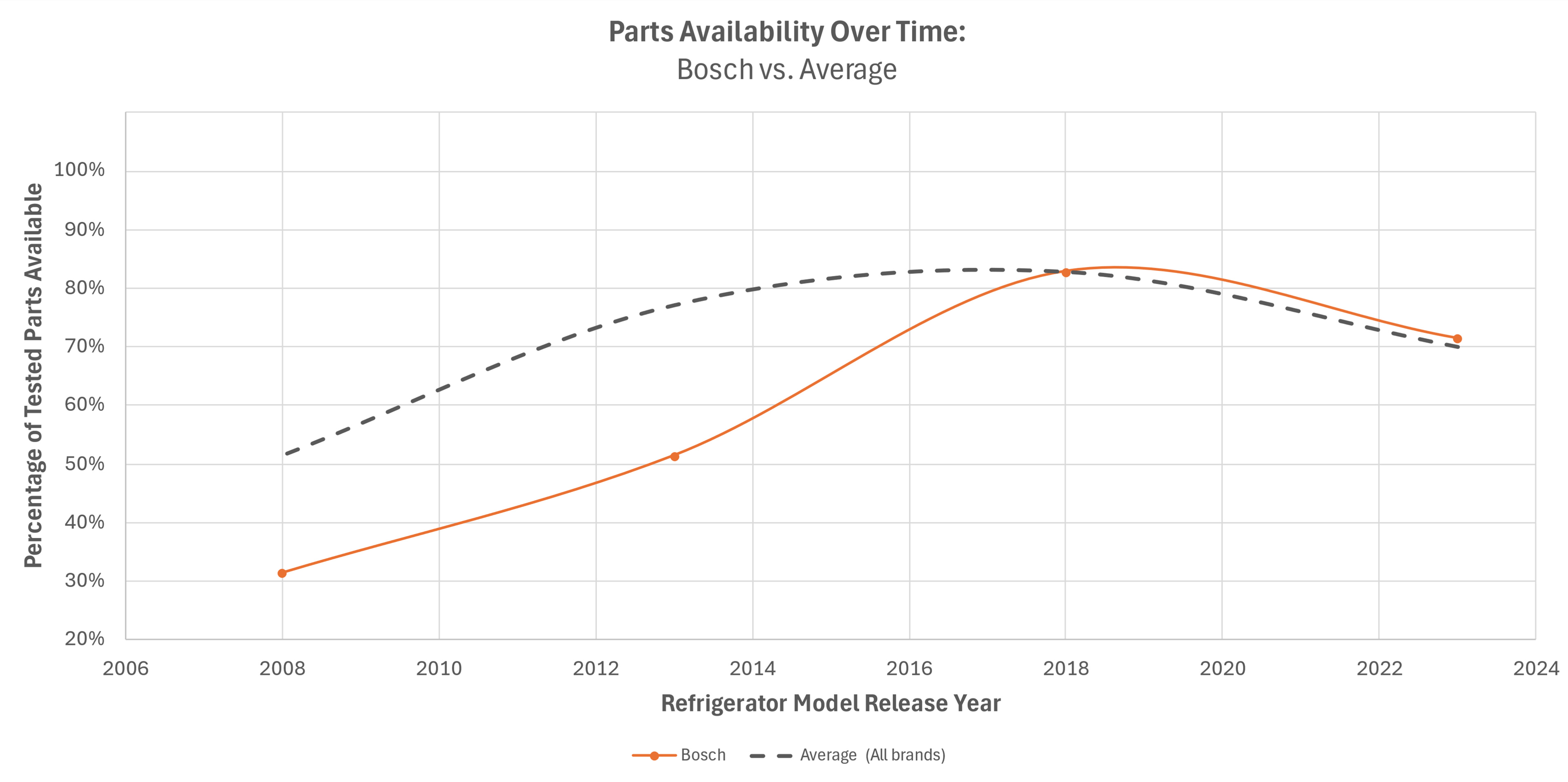 In summary, Whirlpool, Frigidaire, and GE offer the strongest parts support with good availability from early life through to end-of-life and prices that keep repairs economical. LG sits squarely in the middle of the pack, with parts somewhat harder to source across the lifecycle but low prices that give their refrigerators good long-term supportability. Bosch supports newer models well but drops off sharply as units age, with higher part prices making long-term repairs less practical. Samsung trails with the weakest availability, especially early on, and while its heavy part reuse keeps components in production, high demand makes them harder to secure quickly.