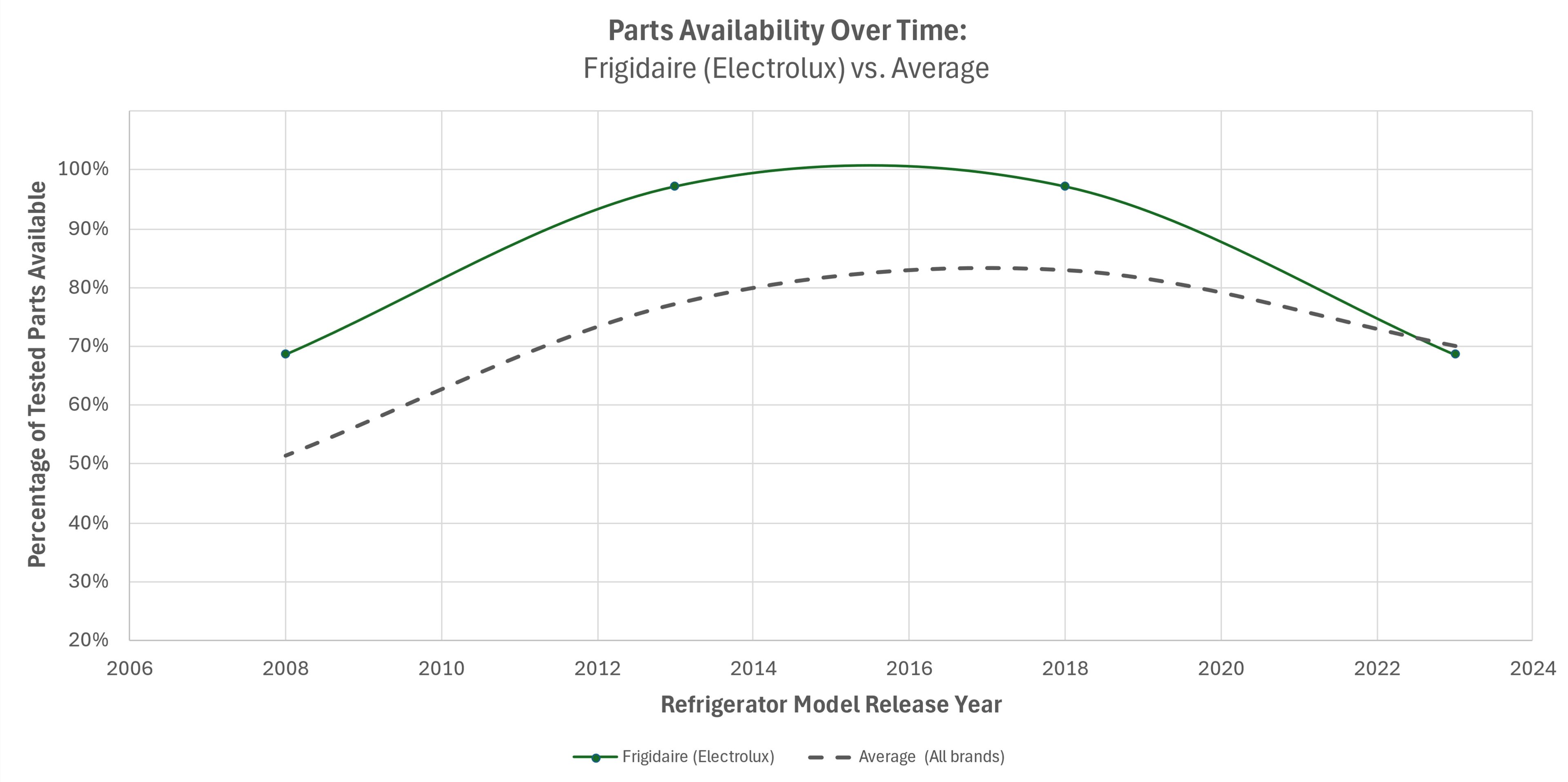 Frigidaire performs very well in terms of parts availability, with most suppliers stocking 100% of parts for mid-life to late-life models. The early life availability is on-par with the industry average, and even EOL models are well supported.
