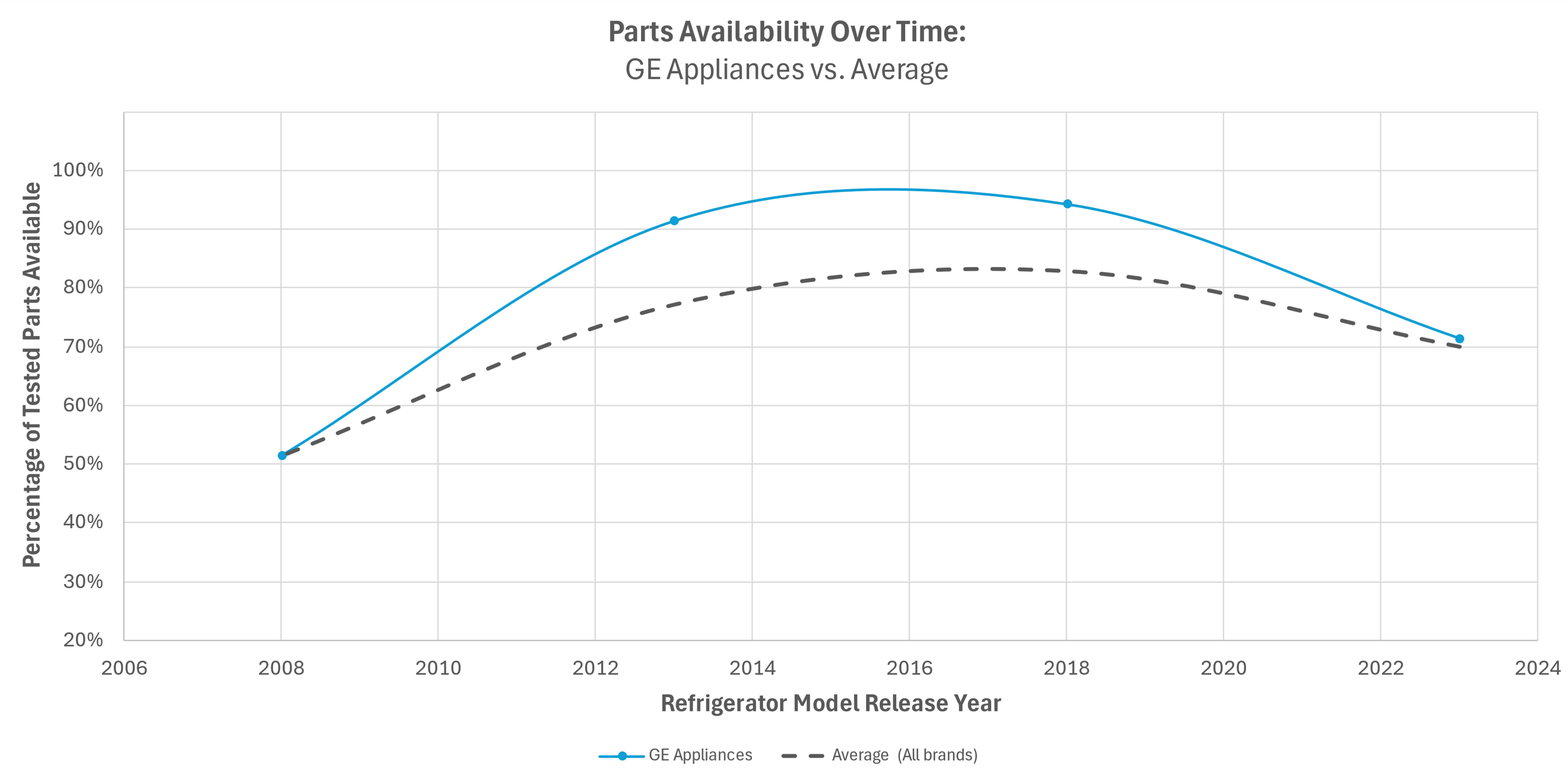 GE lands in a similar tier to Whirlpool and Frigidaire when it comes to parts support for early through late-life models. However, by the time units reach EOL stages, the support drops off, just barely above the industry average, with only around 50% of parts available amongst tested suppliers.