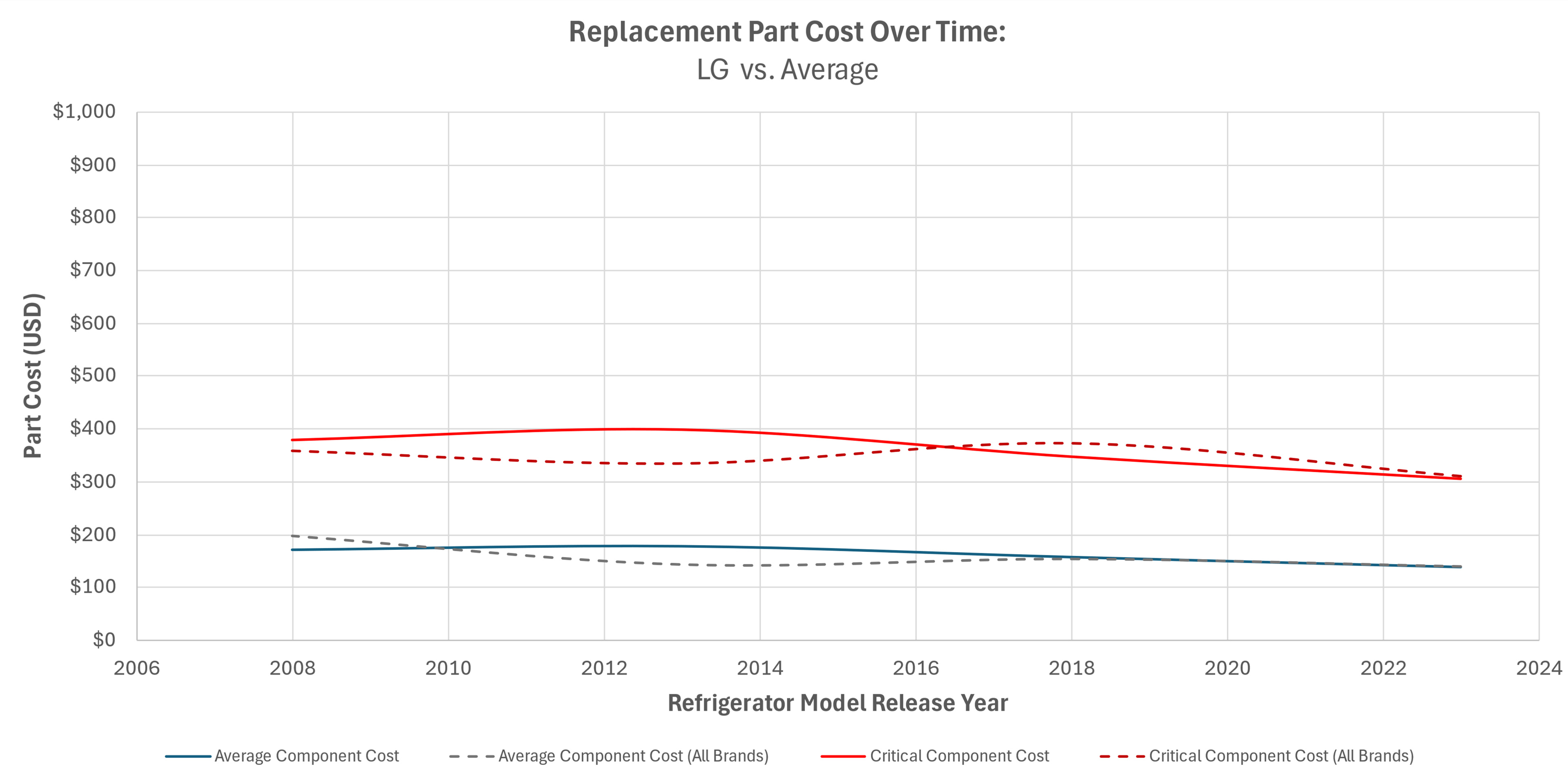 Cost-wise, LG is consistent with the industry average. Like Whirlpool, LG reuses many components across multiple generations. Critical component cost doesn't meaningfully increase over the course of their lifespan, making repair feasible in the event of a compressor or PCB failure.