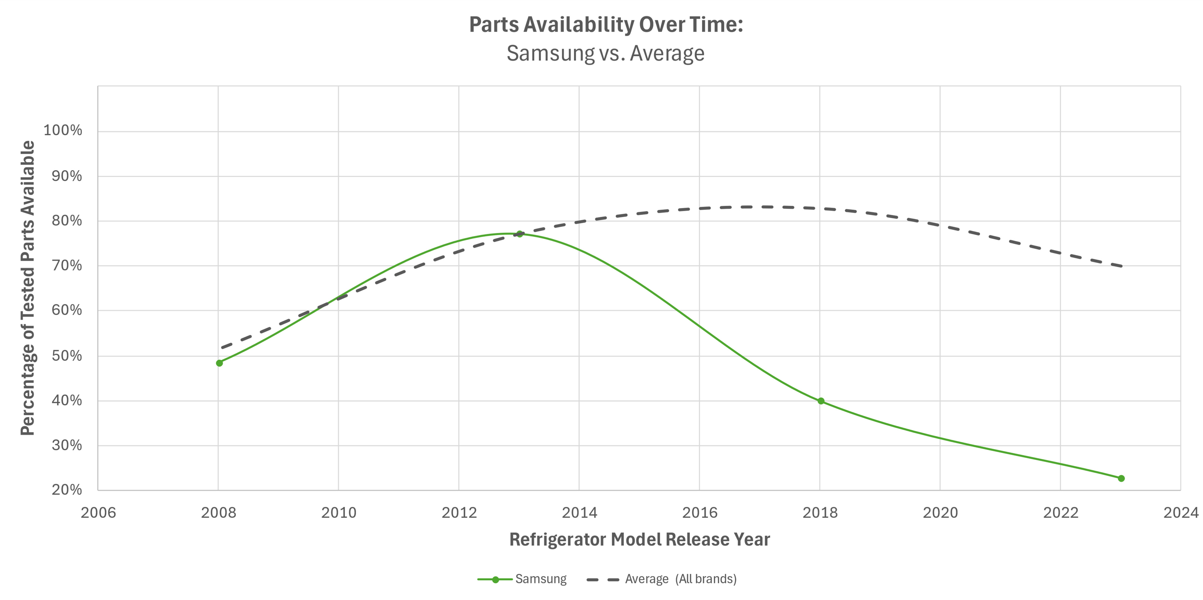 Conversely, Samsung's part costs are the lowest among the brands tested, making repair an economical option at any stage of the appliance's life. Samsung also reuses more components across models than any other brand. The upside is that common parts such as thermistors and fan motors remain in production for many years. The downside is that because so many units depend on them, these parts are often in high demand and can be harder to source quickly, hence the lower overall availability.