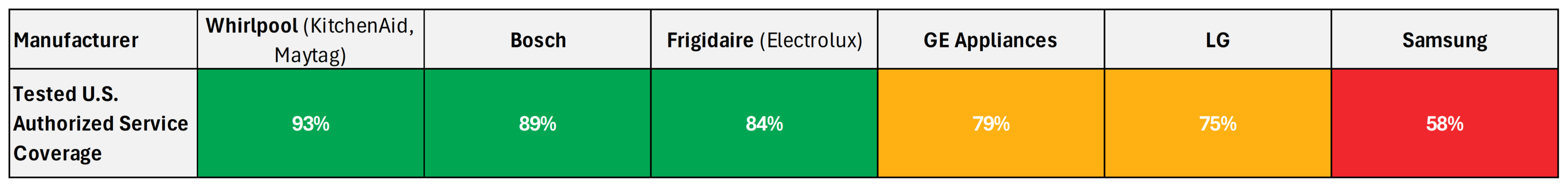 - Samsung: With coverage in only 58% (133/228) of tested locations, Samsung has by far the weakest service network among the major brands. While you'll be covered if you live in a large metro area, authorized service drops sharply across the Midwest and interior states. Despite holding the largest U.S. appliance market share in 2023, Samsung's service network lags behind sales, reinforcing customer complaints of long wait times and difficulty accessing warranty repairs.
